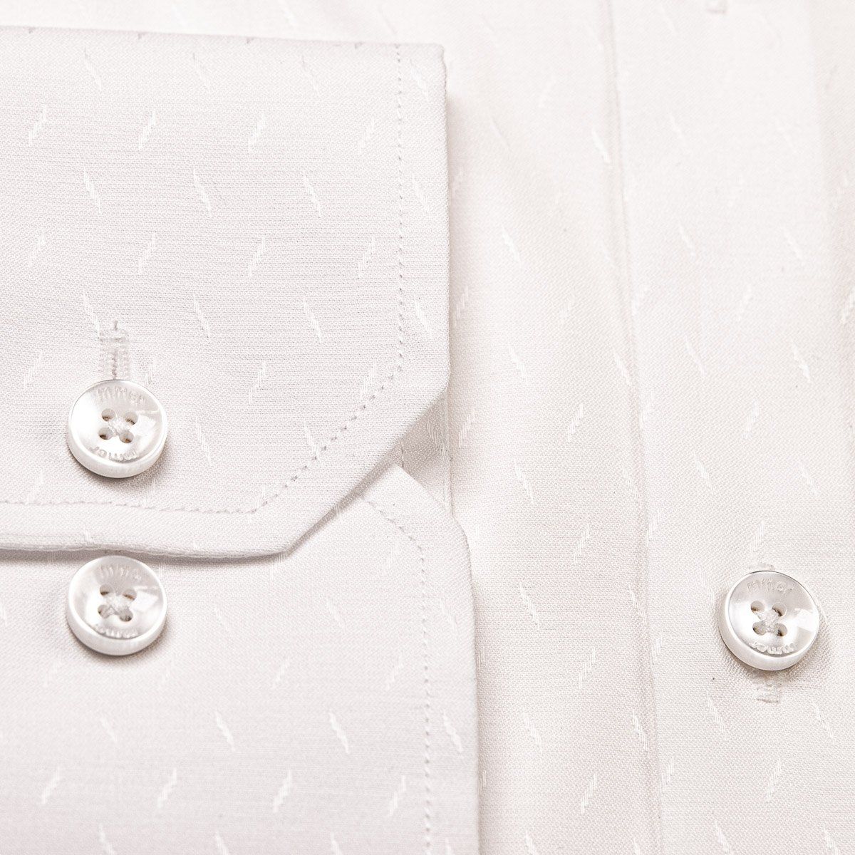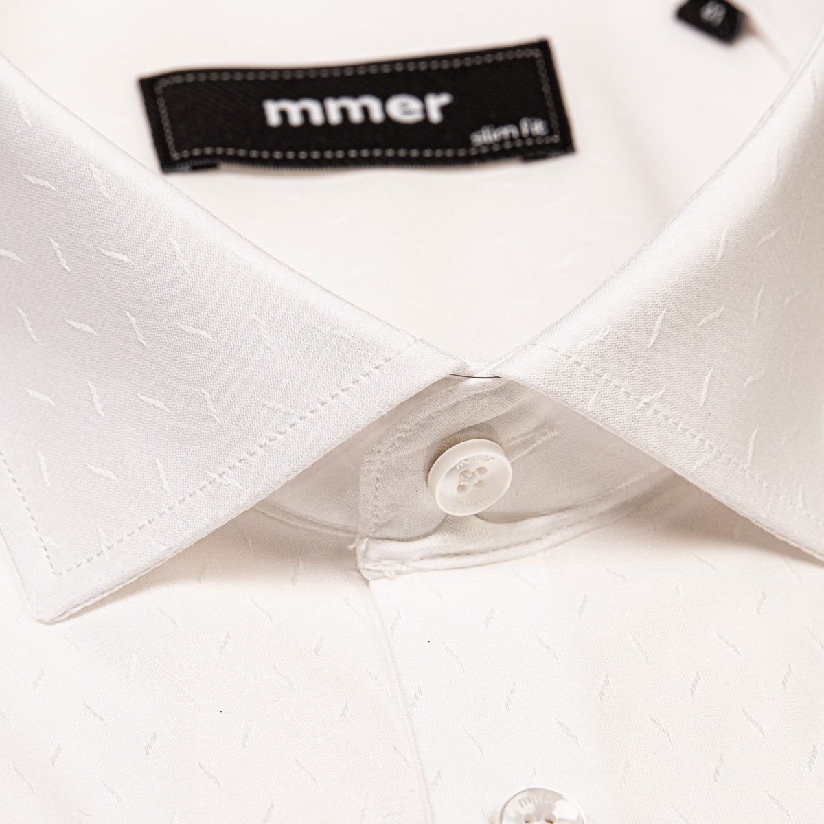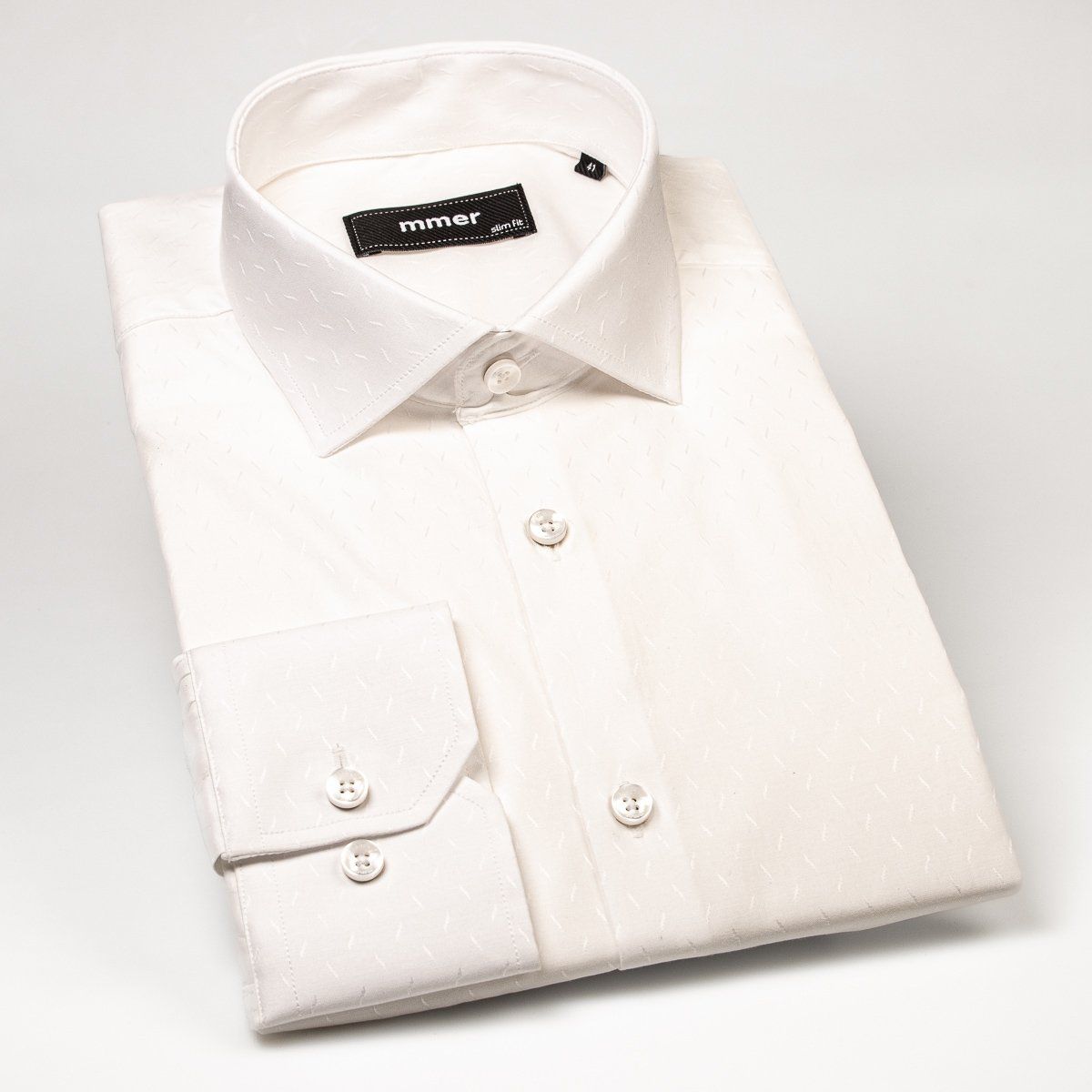 Pánská bavlněná košile značky MMER s dlouhým rukávem v projmutém (slim) střihu. Košile je se vzorem decentních lesklých oválků na smetanové. Košile se hodí jak do zaměstnání, tak na běžné nošení i do společnosti pro méně formální příležitosti. V této košili Vám bude velmi příjemně díky použití kvalitního materiálu ( 97% bavlna, 3% elastan).