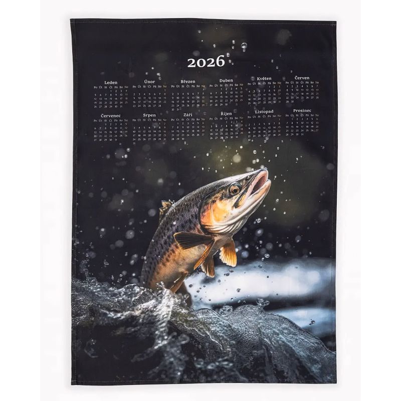 Bavlněný textilní kalendář pro rok 2026 s motivem pstruha v tmavě šedo-zeleném provedení v rozměru 50x70cm. Kalendář poté může sloužit i jako kuchyňská utěrka. Látkový kalendář má jednostranný vzor a je vyroben ze 100% bavlny. Provedení bez hůlky na zavěšení.