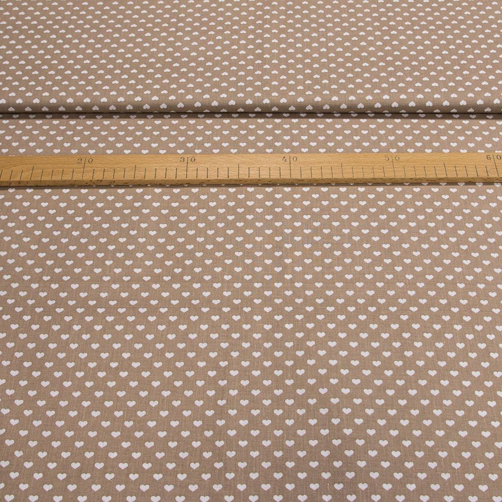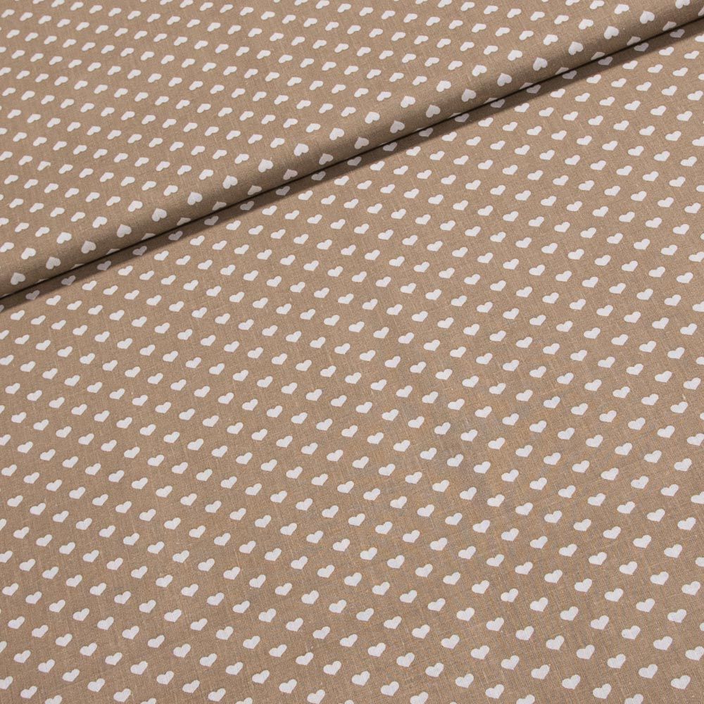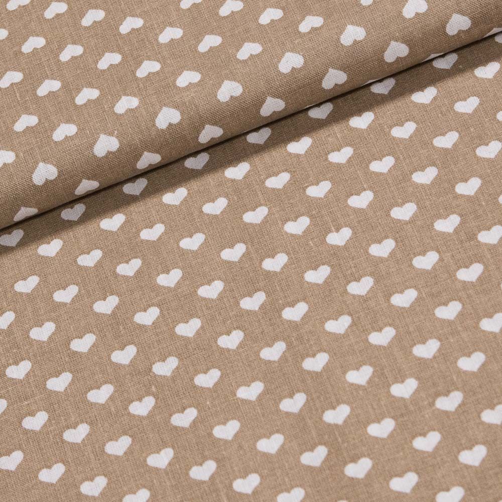 Bavlněná látka (tkanina) s motivem bílých srdíček na béžové. Látka je v šířce 140 cm, vyrobena ze 100% bavlny (gramáž 135g/m2) v plátnové vazbě. Vzor látky je natištěn jen z jedné strany z druhé strany je látka bez potisku.