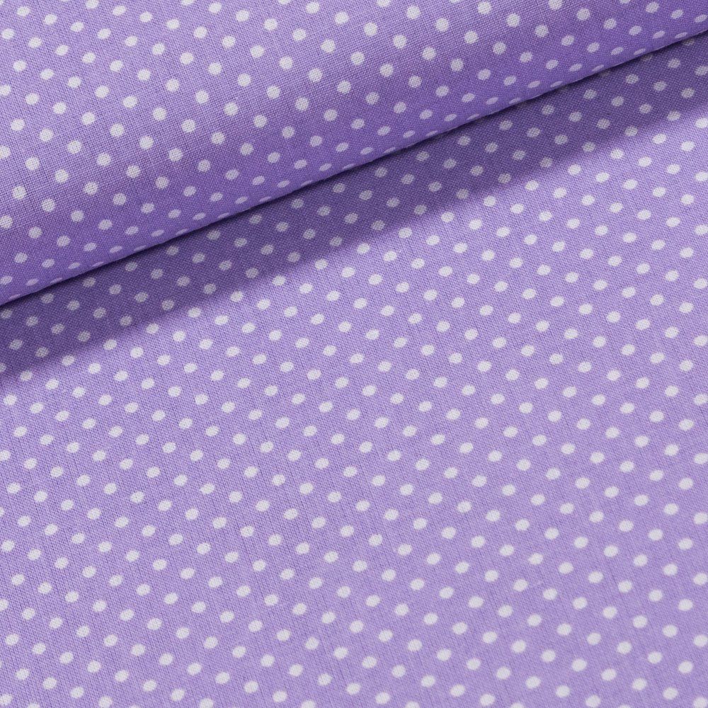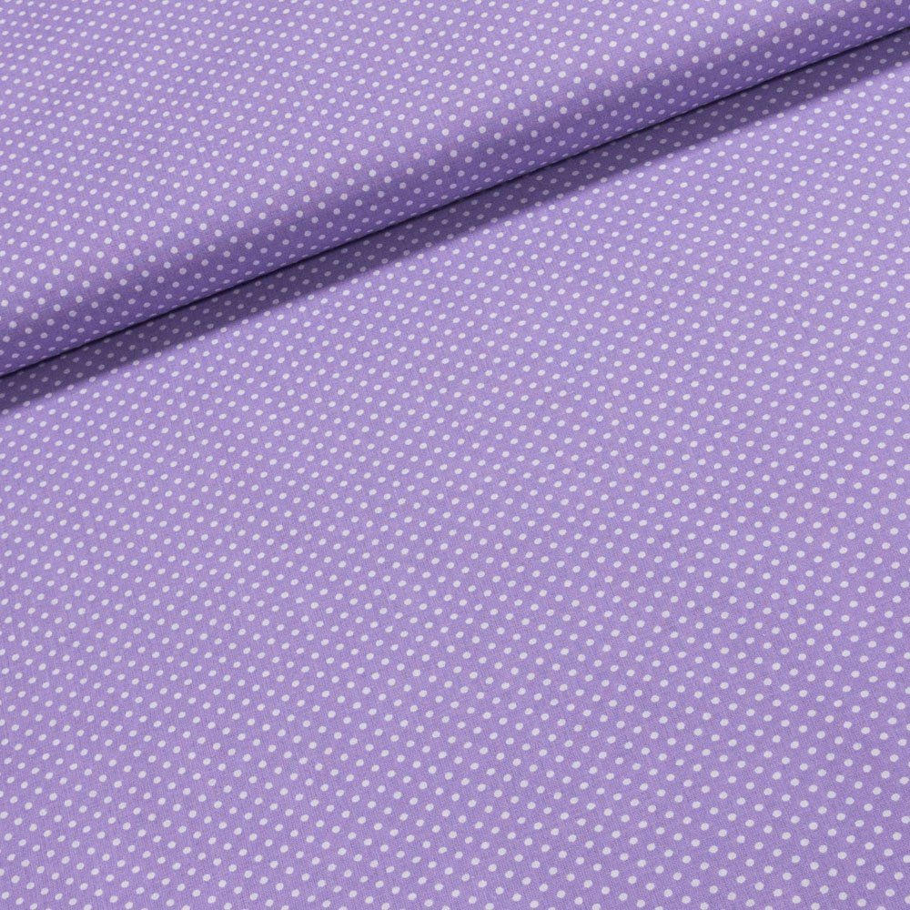 Bavlněná látka (tkanina) s motivem bílých puntíků 2 mm na pastelově střední fialové. Látka je v šířce 150 cm, vyrobena ze 100% bavlny (gramáž 135g/m2) v plátnové vazbě a je potištěná jen z jedné strany z druhé je bez potisku.