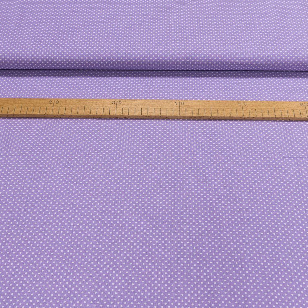 Bavlněná látka (tkanina) s motivem bílých puntíků 2 mm na pastelově střední fialové. Látka je v šířce 150 cm, vyrobena z...