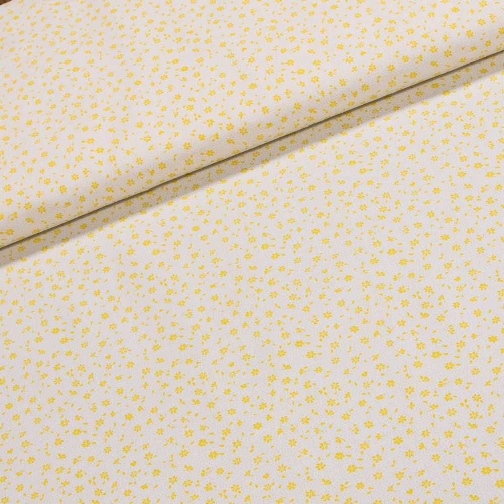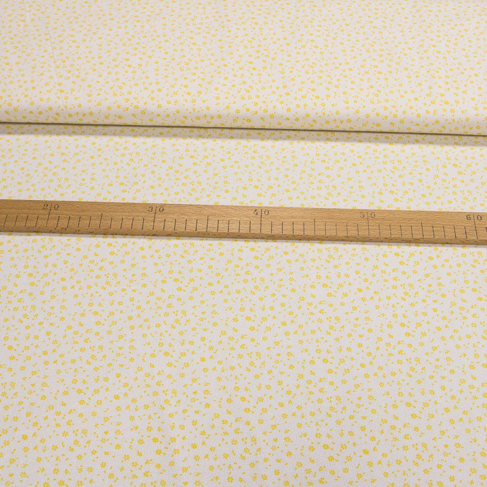 Bavlněná látka (tkanina) s motivem žlutých květinek na bílé. Látka je v šířce 160 cm, vyrobena ze 100% bavlny (gramáž 135g/m2) v plátnové vazbě. Vzor látky je natištěn jen z jedné strany z druhé strany je látka bez potisku.