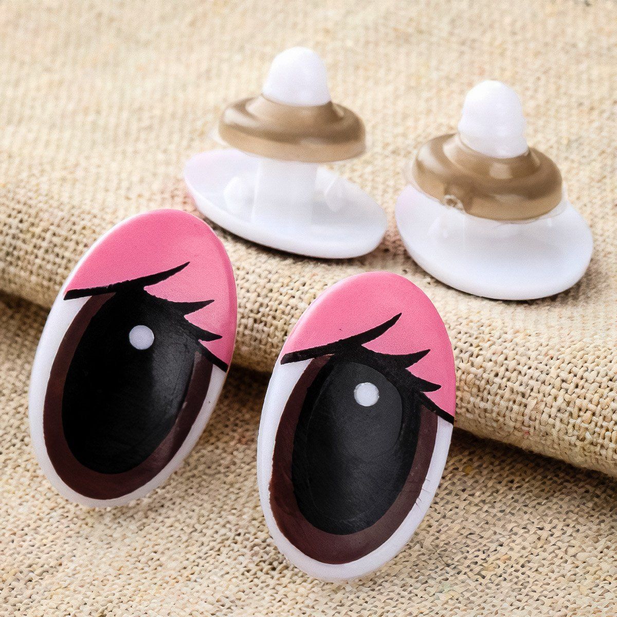 Bezpečnostní oči z tvrzeného plastu v rozměru 26x16mm s tištěným motivem hnědých očí, řas a obočí v růžové barvě. Oči jsou vhodné pro výrobu hraček, dekorací a další doplňky. Díky bezpečnostní zarážce proti vypadnutí jsou oči odolnější vůči vytrhnutí nebo sloupnutí z výrobku. Cena je za 1ks včetně zarážky. Objednávat lze pouze jako pár (2ks).