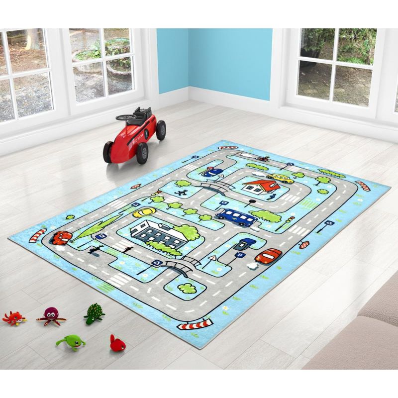 Kusový dětský koberec s 3D fototiskovým vzorem autíčkové dráhy se silnicemi a domečky ve světle modrém provedení v rozměru 100x150cm. Běhoun je vhodný do dětských pokojů a díky vzoru silnic si na mě lze hrát i s angličáky. Speciální 3D fototiskové provedení koberce zaujme svým realistickým vzhledem, věrnými barvami i nezvykle příjemným pocitem na dotek. Jsou vyrobeny ze 100% polypropylenu. Latexový nátěr na spodní straně běhounu vytváří protiskluzový povrch, takže Vám nehrozí uklouznutí na mokré podlaze. Koberec bývá někdy s českými nápisy, někdy s anglickými nápisy, viz fotografie. Jazykovou variantu si při objednání bohužel nelze vybrat. Zašleme vždy takový, jaký bude aktuálně na skladě.