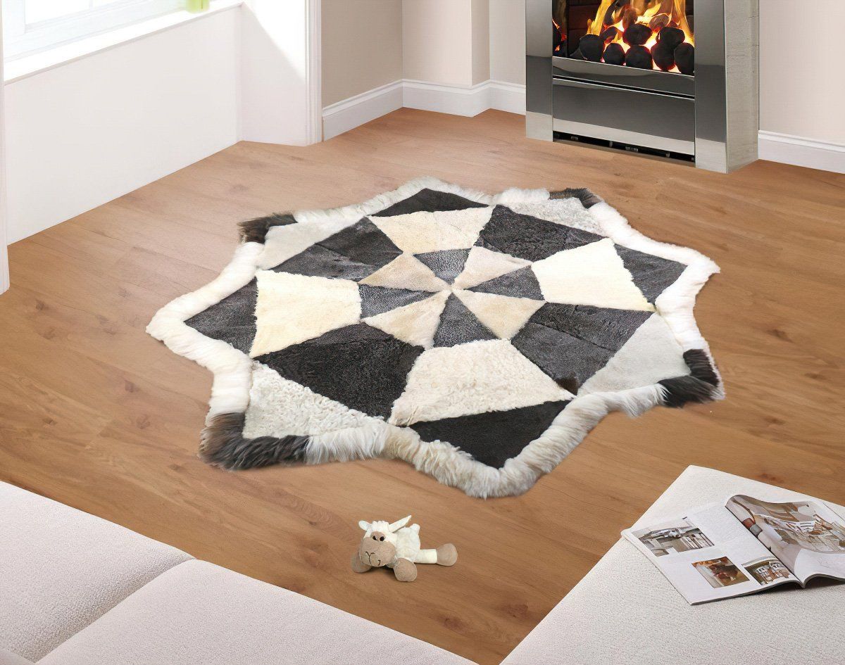 Přírodní světlá a tmavá ovčí kožešina v podobě koberce z pravého 100% ovčího evropského merina. Ovčí kůže je již vyčiněná a vyznačuje se charakteristickými vlastnostmi jako termoregulační vlastnost, odolnost proti zašpinění či jemný příjemný povrch, který nekouše a nedráždí lidskou pokožku. Koberec či předložka z ovčí vlny je ideálním doplňkem interiéru. Kožešina má tvar osmiúhelníku v rozměru cca 110 x 110 cm. Foto je pouze ilustrativní, každý kus je originál.