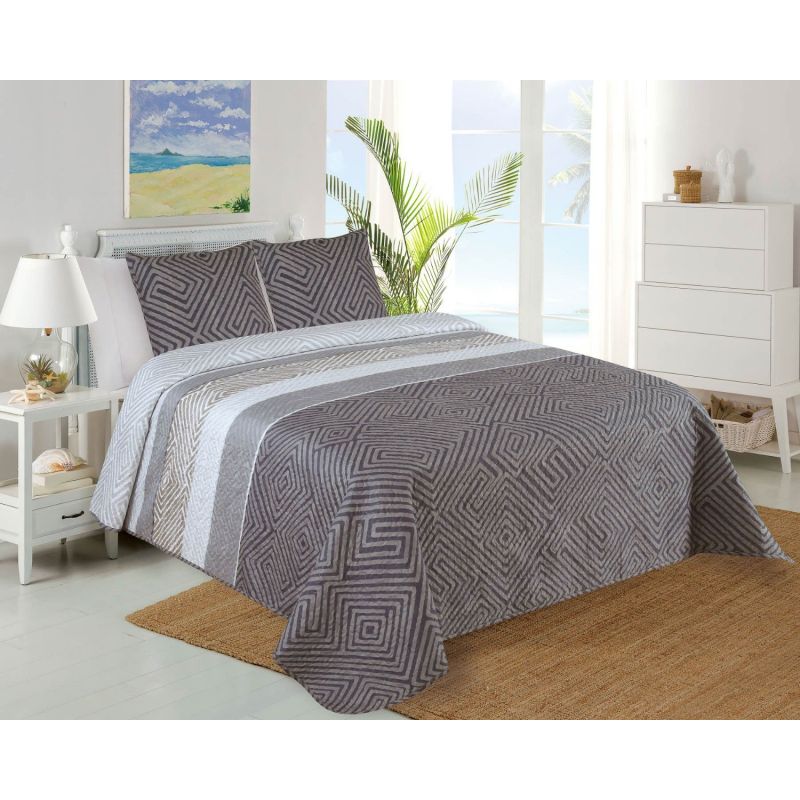 Přehoz na postel s geometrickým vzorem pruhů v šedo-hnědých barvách. Přehoz je k dispozici na dvoulůžko v rozměru 220 x 240 cm a je dodáván se 2 povlaky na polštář 45 x 45cm v hladkém provedení ze 100% polyesteru s prolisovaným vzorem jakoby proševu.