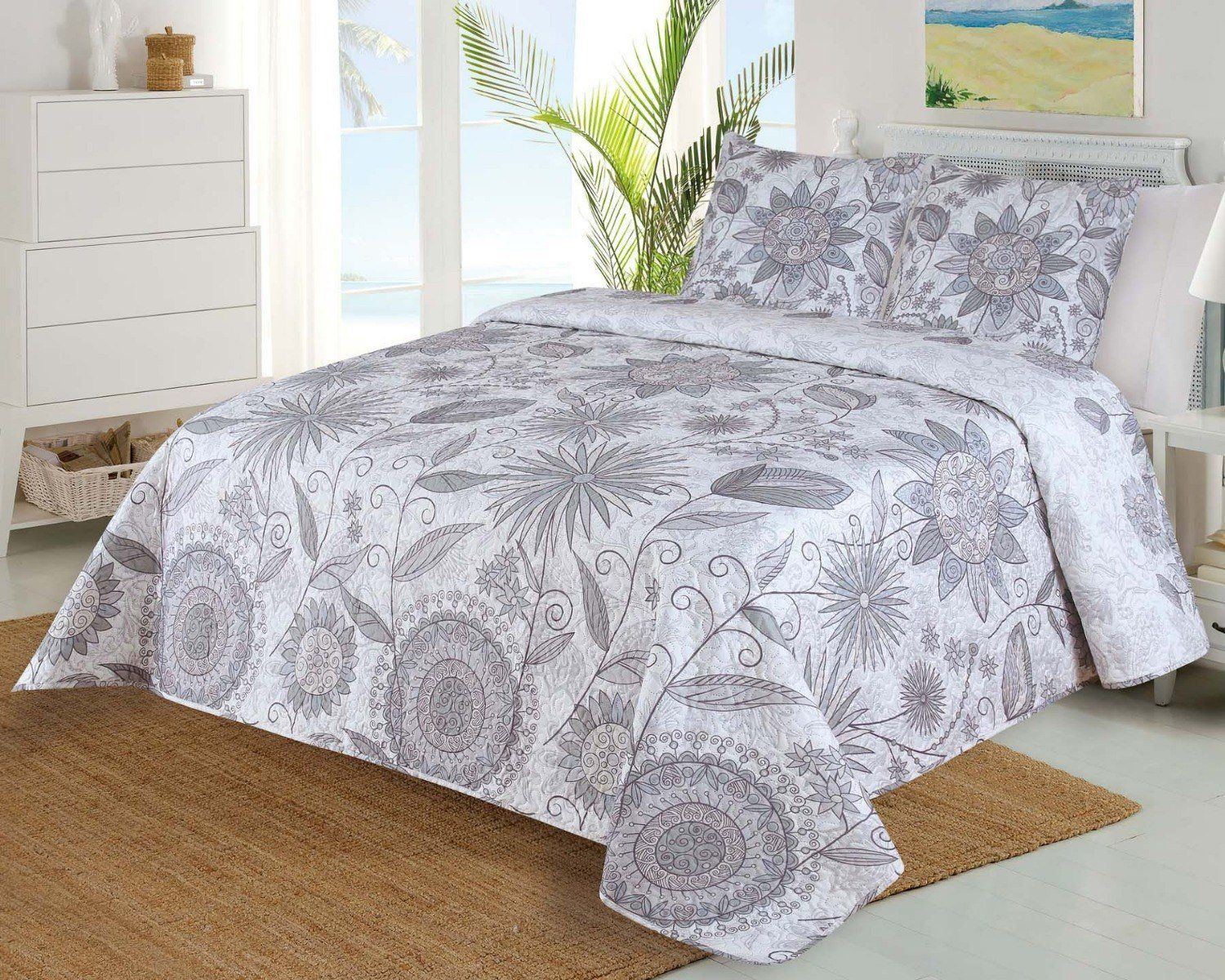 Přehoz na postel s květinovým vzorem v šedých barvách. Přehoz je k dispozici na dvoulůžko v rozměru 220 x 240 cm a je dodáván se 2 povlaky na polštář 45 x 45cm v hladkém provedení ze 100% polyesteru s prolisovaným vzorem jakoby proševu.