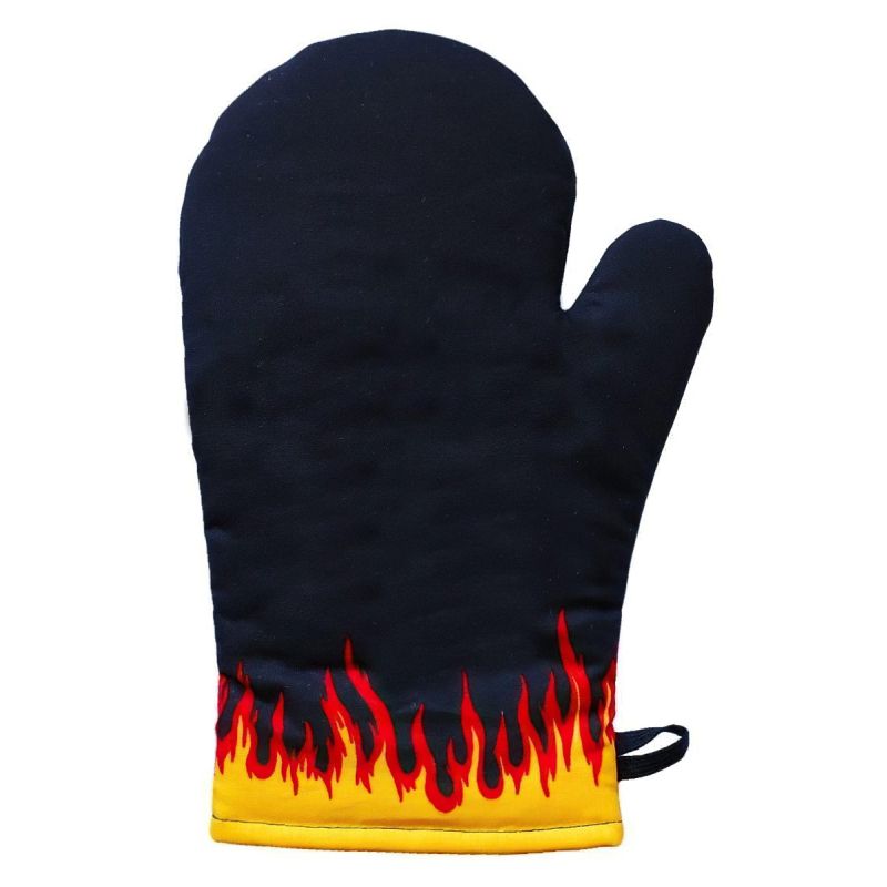 Kuchyňská chňapka (rukavice) v černé barvě ze spodním lemem, který tvoří plameny. Chňapka má všitý magnet a poutko na zavěšení. Chňapka je v rozměru 28x18cm a je vyrobena ze 100% bavlny s výplní ze 100% polyesteru (rouno z dutého vlákna).