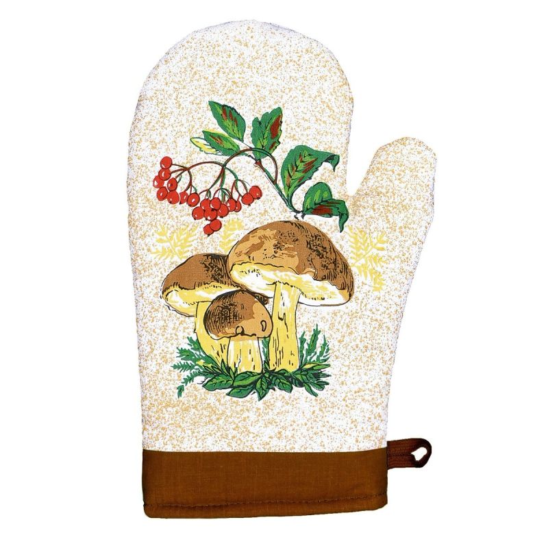 Kuchyňská chňapka (rukavice) se vzorem hub v hnědém provedení. Chňapka má všitý magnet a poutko na zavěšení. Chňapka je v rozměru 28x18cm a je vyrobena ze 100% bavlny s výplní ze 100% polyesteru (rouno z dutého vlákna).