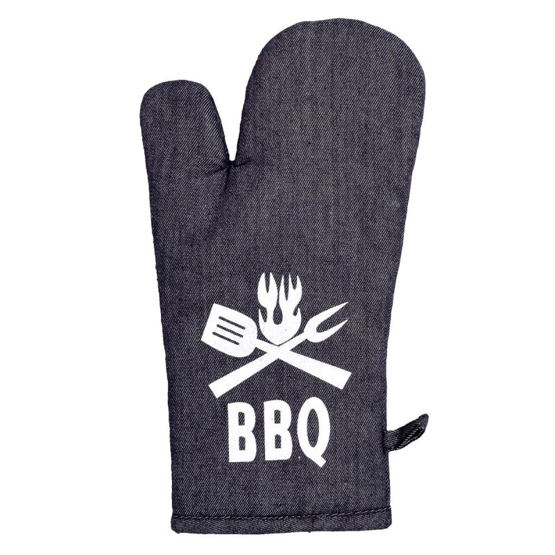 Kuchyňská chňapka (rukavice) s kuchyňským jednostranným vzorem příboru a nápisu BBQ uprostřed na šedomodrém podkladu z pevné rifloviny. Chňapka má všitý magnet a poutko na zavěšení. Chňapka je v rozměru 28x18cm a je vyrobena ze 100% bavlny s výplní ze 100% polyesteru (rouno z dutého vlákna).