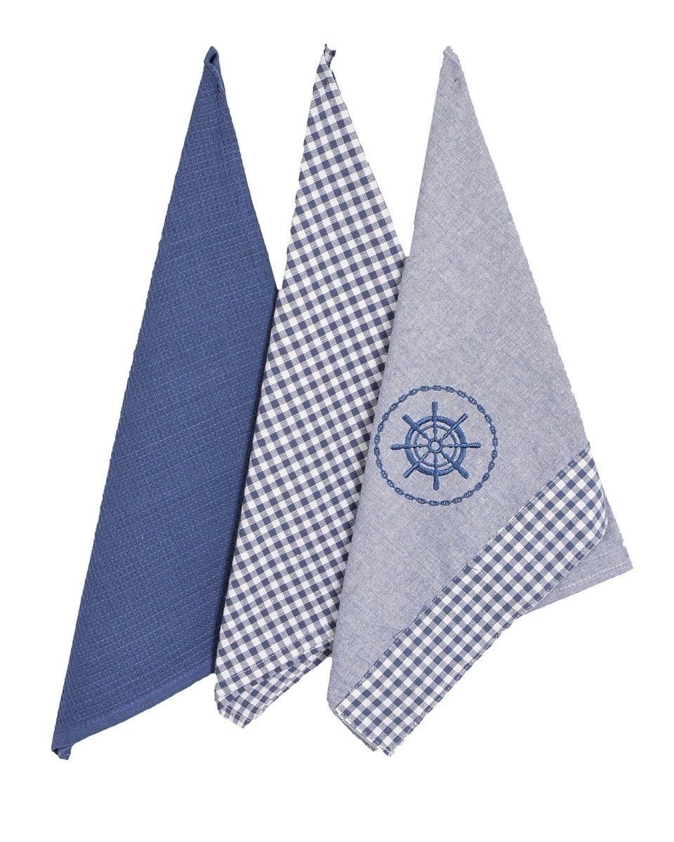 Kuchyňská sada se vzorem kára a kruhu s kormidlem v modré barvě. Kuchyňský set může obsahovat zástěru, utěrky, chňapky a...
