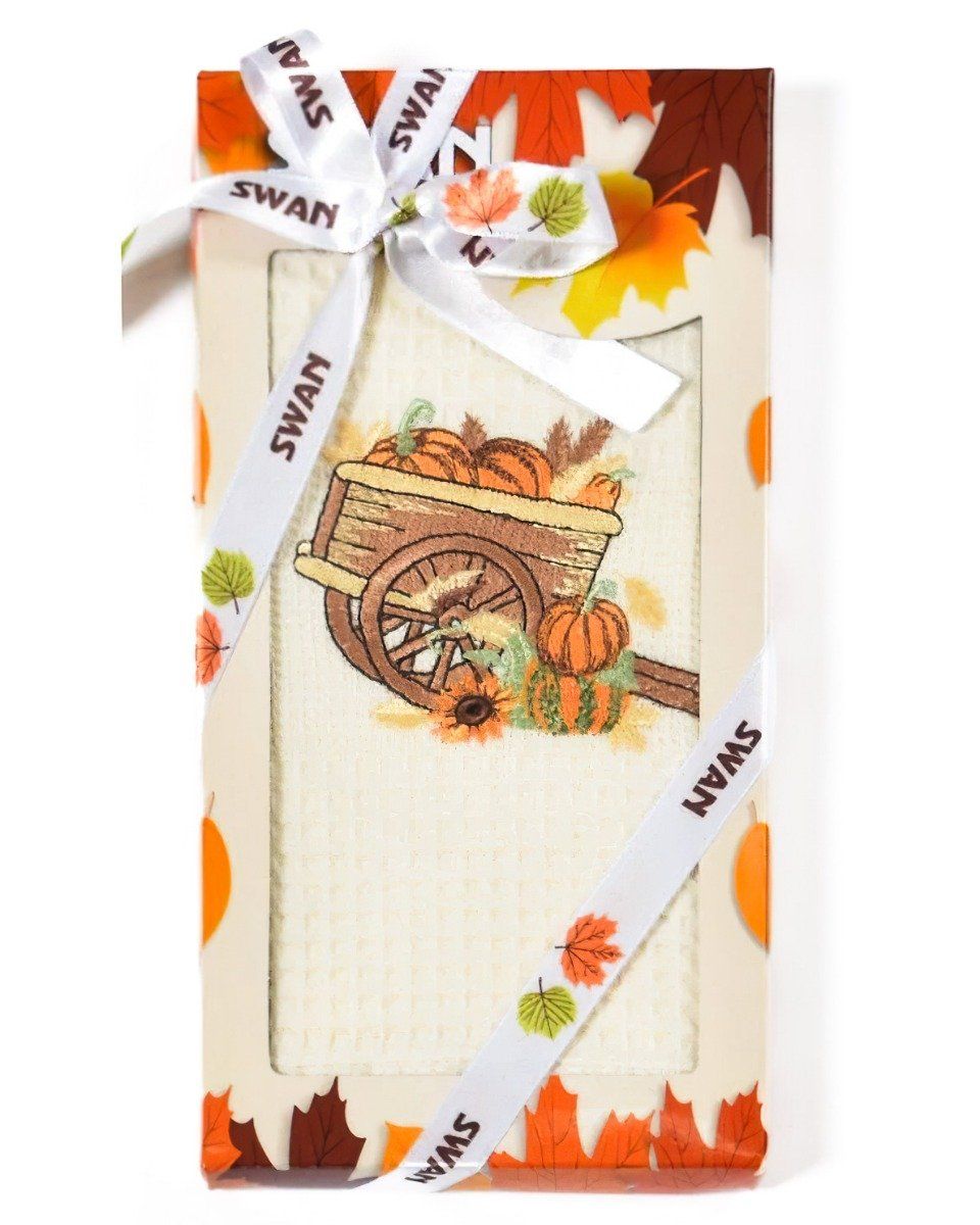Utěrka SWAN 61 vaflová vyšívaná, dárkové balení, vozík s dýněmi na smetanové, 1 kus 50x70cm