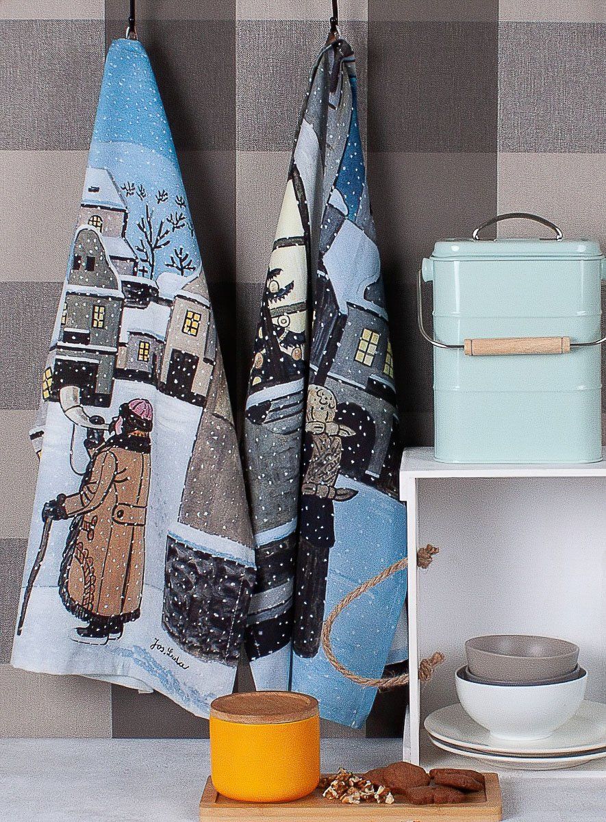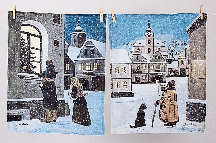 Bavlněné utěrky s motivem zimy v typické kresbě Josefa Lady v modro-bílém provedení v rozměru 50x64cm. Utěrky mají jedno...