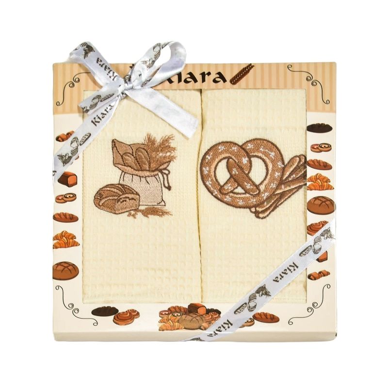 Utěrky KIARA 152 vaflové vyšívané, dárkové balení, pečivo a preclík na smetanové, 2 kusy 50x70cm