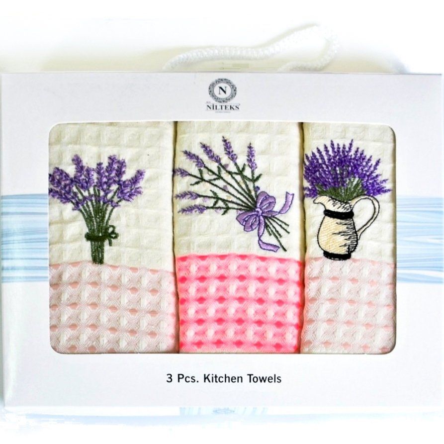 Bavlněné vaflové utěrky s motivem levandule na fialovo-růžovo-smetanovém podkladu. Balení obsahuje 3 kusy utěrek v rozměru 50x70cm. Utěrky jsou baleny v ozdobné dárkové krabičce a jsou vyrobeny ze 100% bavlny.