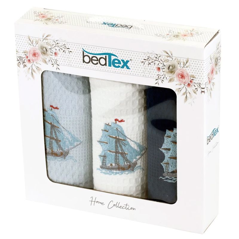 Bavlněné vaflové utěrky s motivem vyšívaných lodí na modrém a bílém podkladu. Balení obsahuje 3 kusy utěrek v rozměru 40x60cm. Utěrky jsou baleny v ozdobné dárkové krabičce a jsou vyrobeny ze 100% bavlny.