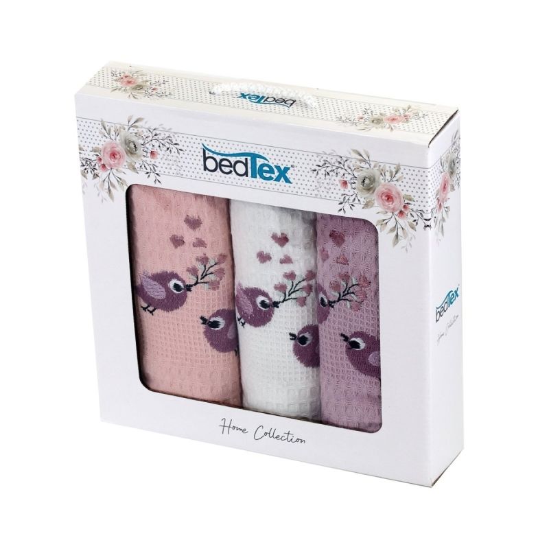 Bavlněné vaflové utěrky s motivem vyšívaných ptáčků v růžových barvách. Balení obsahuje 3 kusy utěrek v rozměru 40x60cm. Utěrky jsou baleny v ozdobné dárkové krabičce a jsou vyrobeny ze 100% bavlny.