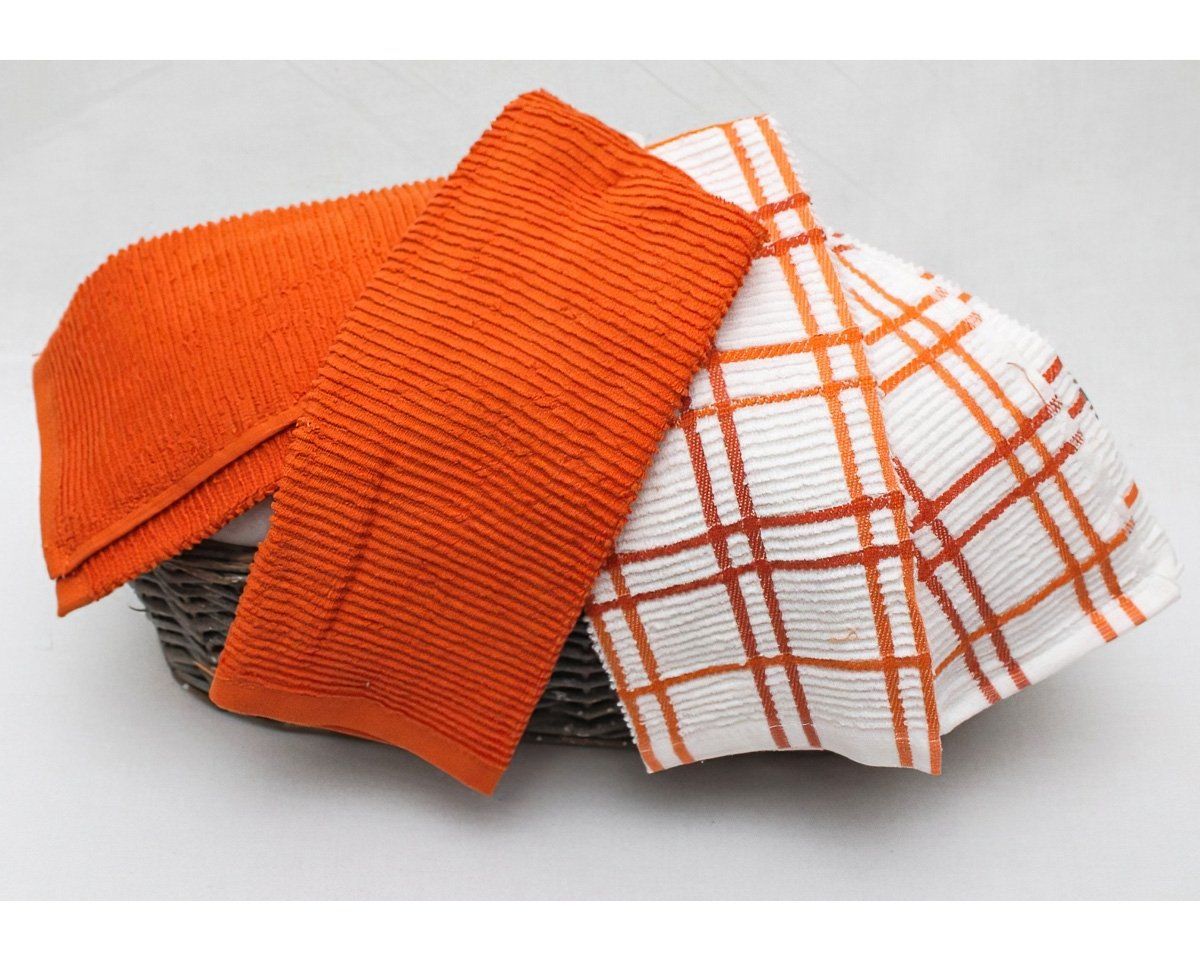 Bavlněné froté utěrky. Balení obsahuje 2 kusy utěrek v rozměru 40x60cm v provedení 1 kus v jednobarevné oranžové barvě a 1 kus oranžové káro na bílé. Utěrky jsou vyrobeny z kvalitního materiálu froté v gramáži 250 g/m2.