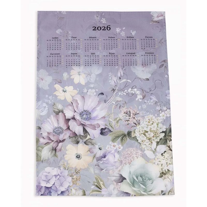 Textilní kalendář, utěrka CALIMERA 2026, květinový vzor, fialový, 50x70cm, bez hůlky