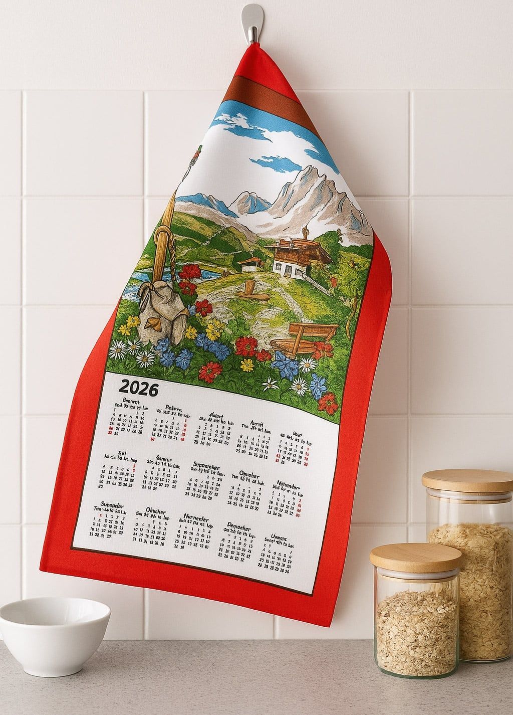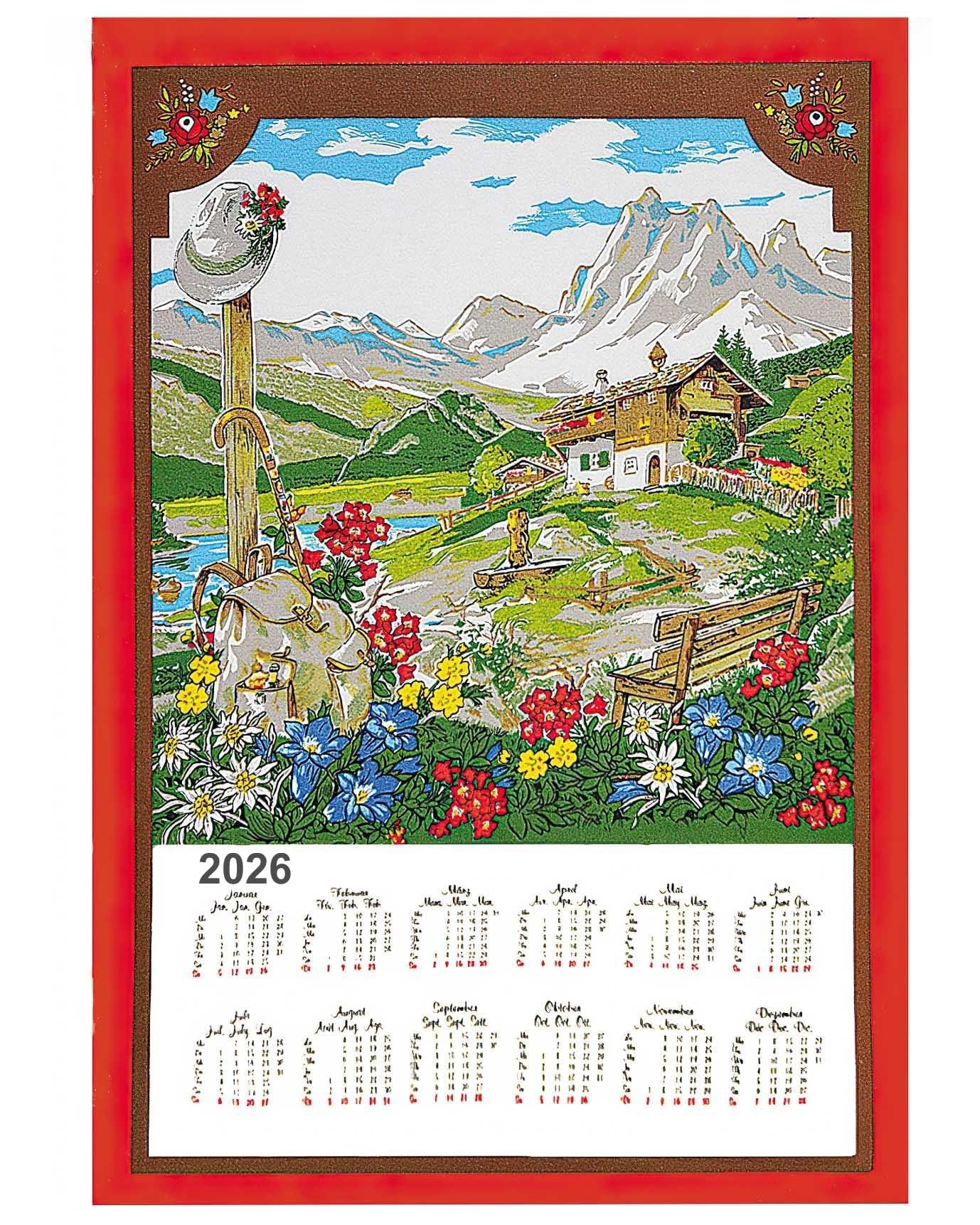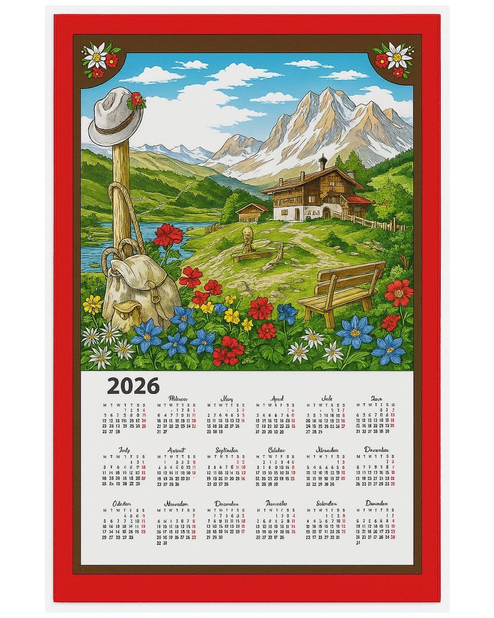 Bavlněný textilní kalendář pro rok 2026 s horským prostředím s červeným okrajem v rozměru 45x65cm. Kalendář poté může sloužit i jako kuchyňská utěrka. Látkový kalendář má jednostranný vzor a je vyroben ze 100% bavlny. Provedení bez hůlky na zavěšení.