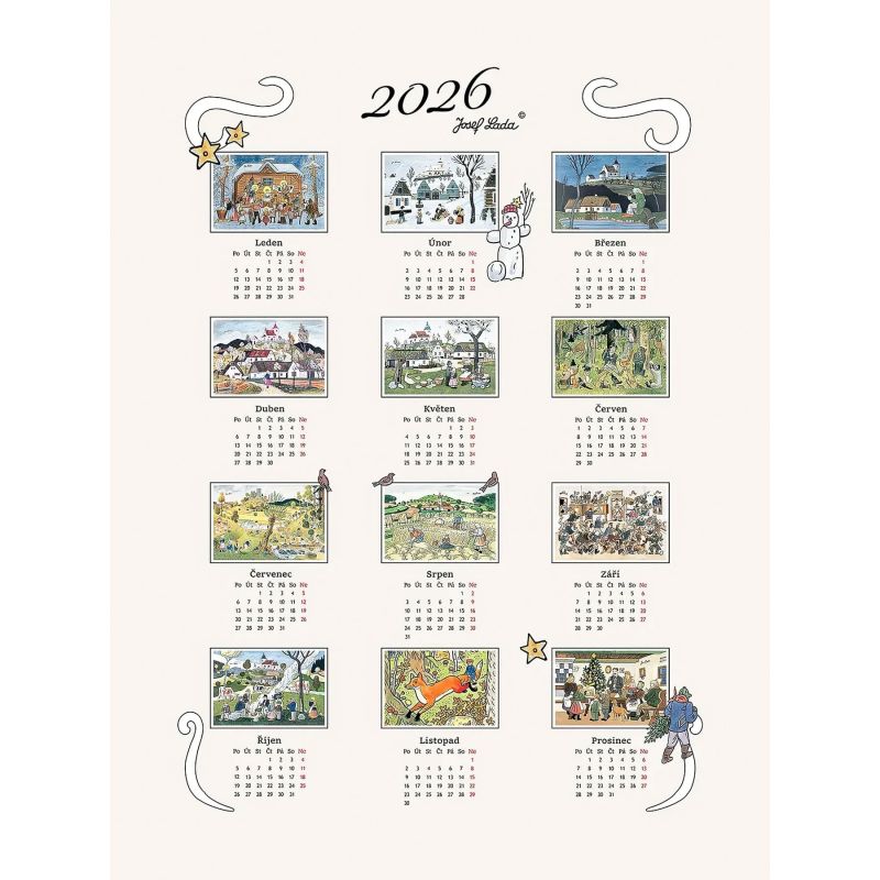 Bavlněný textilní kalendář pro rok 2026 s motivem typických kreseb Josefa Lady ve smetanovém provedení v rozměru 50x70cm. Kalendář poté může sloužit i jako kuchyňská utěrka. Látkový kalendář má jednostranný vzor a je vyroben ze 100% bavlny. Provedení bez hůlky na zavěšení....