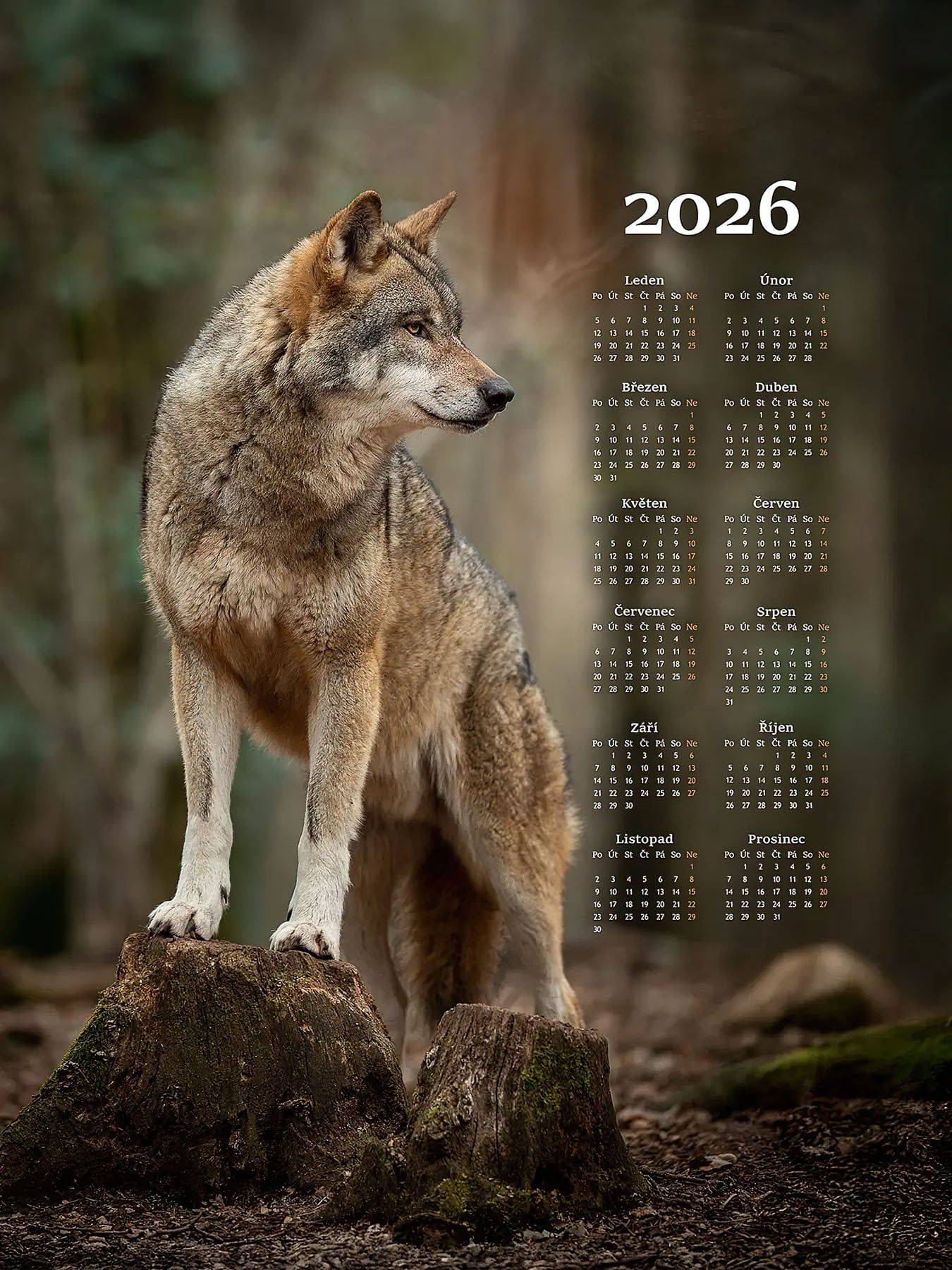 Bavlněný textilní kalendář pro rok 2026 s motivem vlka v hnědo-zeleném provedení v rozměru 50x70cm. Kalendář poté může s...