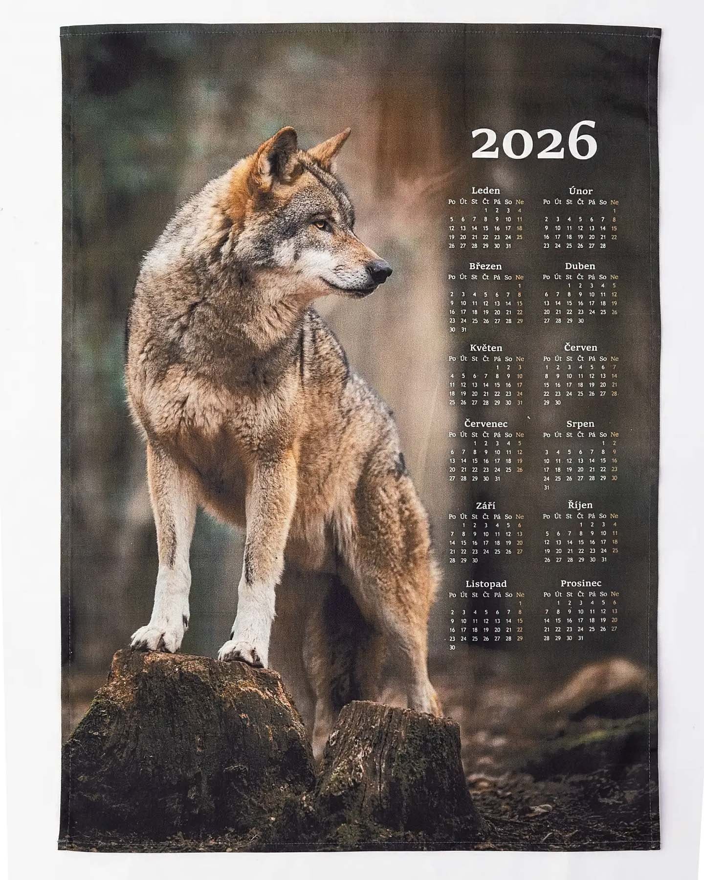 Bavlněný textilní kalendář pro rok 2026 s motivem vlka v hnědo-zeleném provedení v rozměru 50x70cm. Kalendář poté může sloužit i jako kuchyňská utěrka. Látkový kalendář má jednostranný vzor a je vyroben ze 100% bavlny. Provedení bez hůlky na zavěšení.
