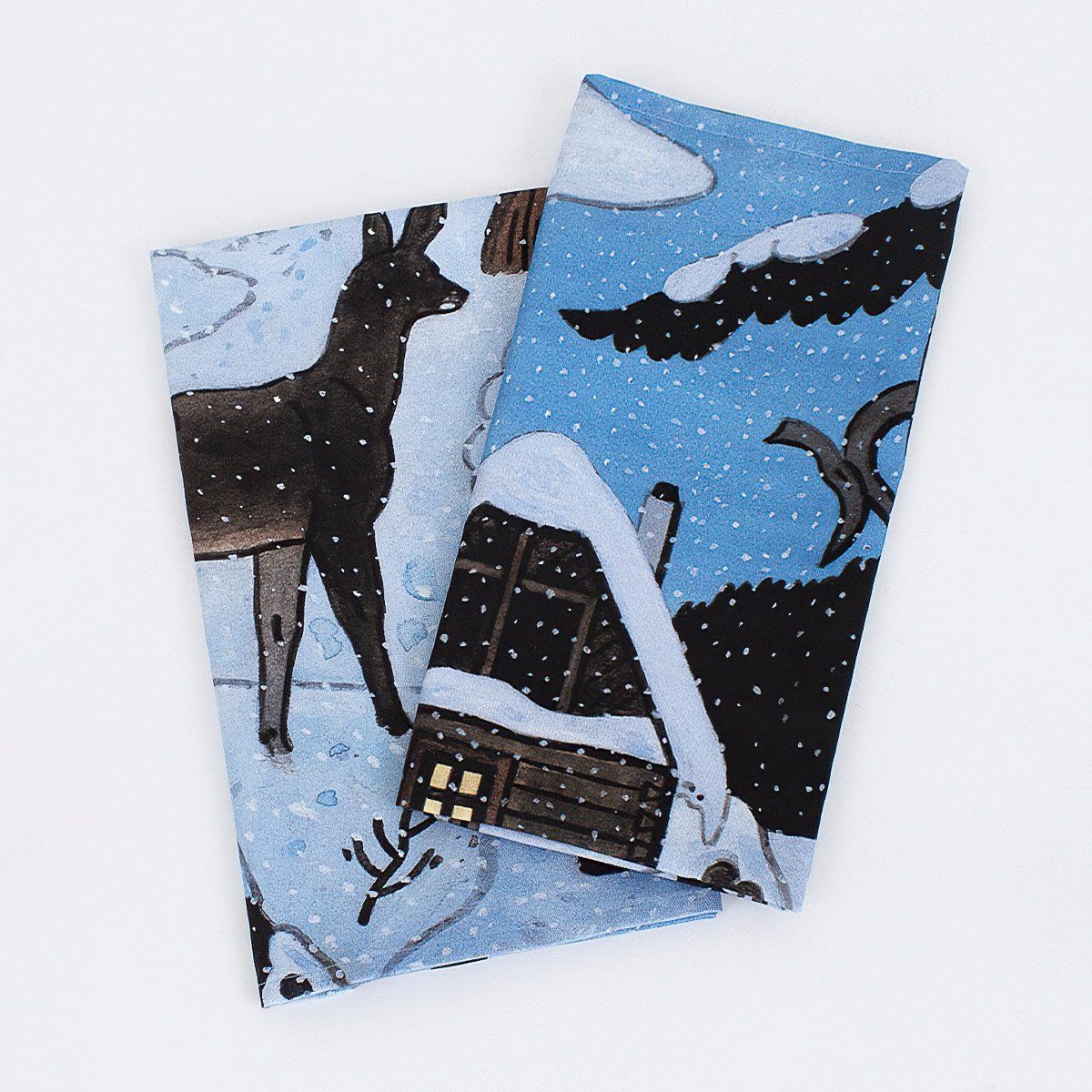 Bavlněné utěrky s motivem zimy a Vánoc se srnkou a zajícem v typické kresbě Josefa Lady v modro-bílém provedení v rozměr...