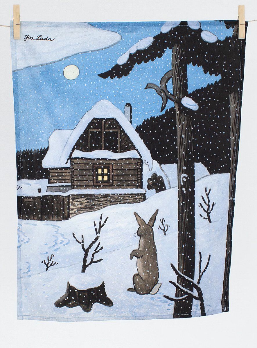 Bavlněné utěrky s motivem zimy a Vánoc se srnkou a zajícem v typické kresbě Josefa Lady v modro-bílém provedení v rozměru 50x64cm. Utěrky mají jednostranný vzor a jsou vyrobeny ze 100% bavlny. Utěrky jsou v dárkovém balení vždy 1x motiv srnka, 1x motiv zajíc.