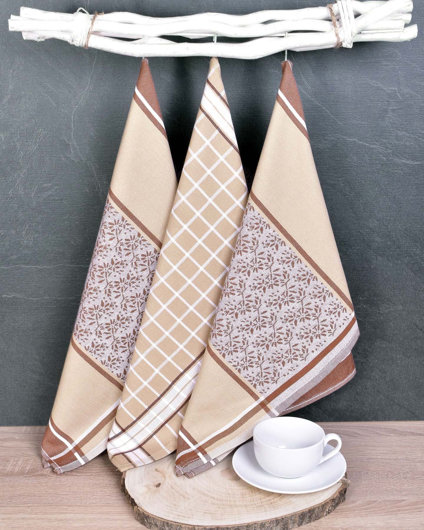 Kuchyňské utěrky EGYPTSKÁ BAVLNA DORO BEIGE MIX, béžové ornamenty v proužku a kostka, 3 kusy, 50x70cm