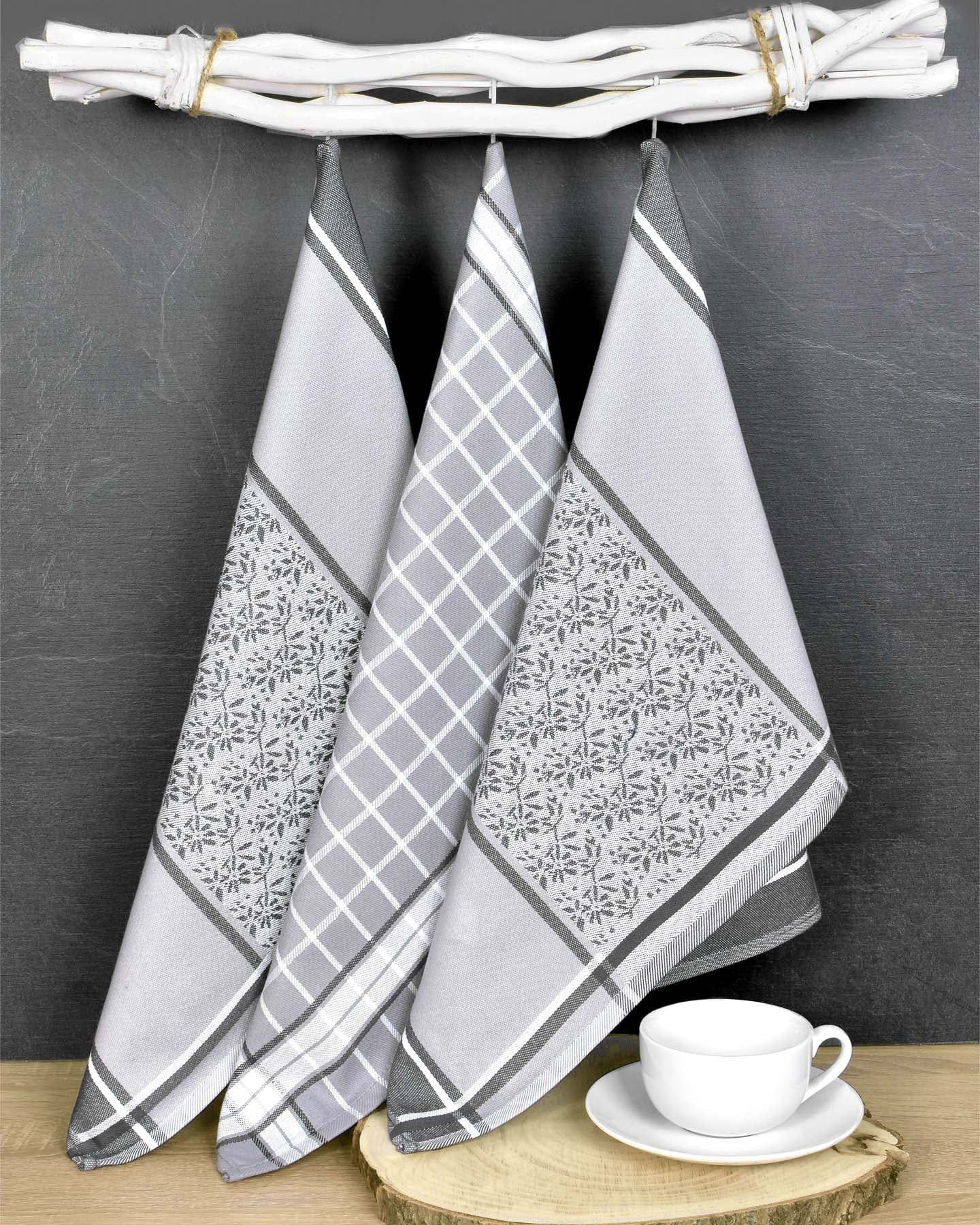 Kuchyňské utěrky EGYPTSKÁ BAVLNA DORO GREY MIX, šedé ornamenty v proužku a kostka, 3 kusy, 50x70cm