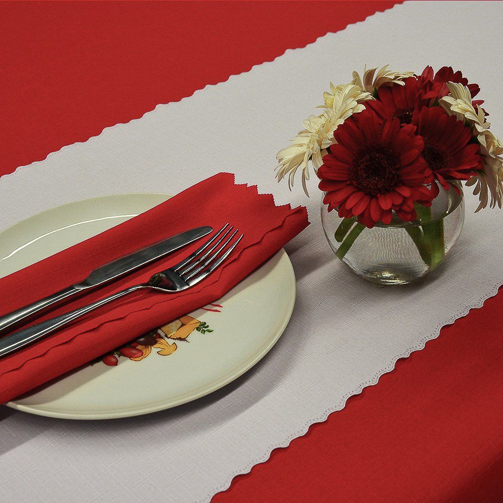 Hotový látkový kuchyňský ubrus s vodoodpudivou teflonovou vrstvou v červené barvě s vlnkovanými okraji. Díky teflonové vrstvě se rozlité tekutiny do ubrusu nevsáknou a dají se snadno setřít ubrouskem (neplatí však pro mastnotu). Teflonové ubrusy jsou dostupné v mnoha rozměrech a tvarech (obdélník, ovál, kruh). Ubrus je vyroben ze 100% polyesteru v gramáži 175 g/m2. Rozměr ubrusu vyberte v nabídce níže.