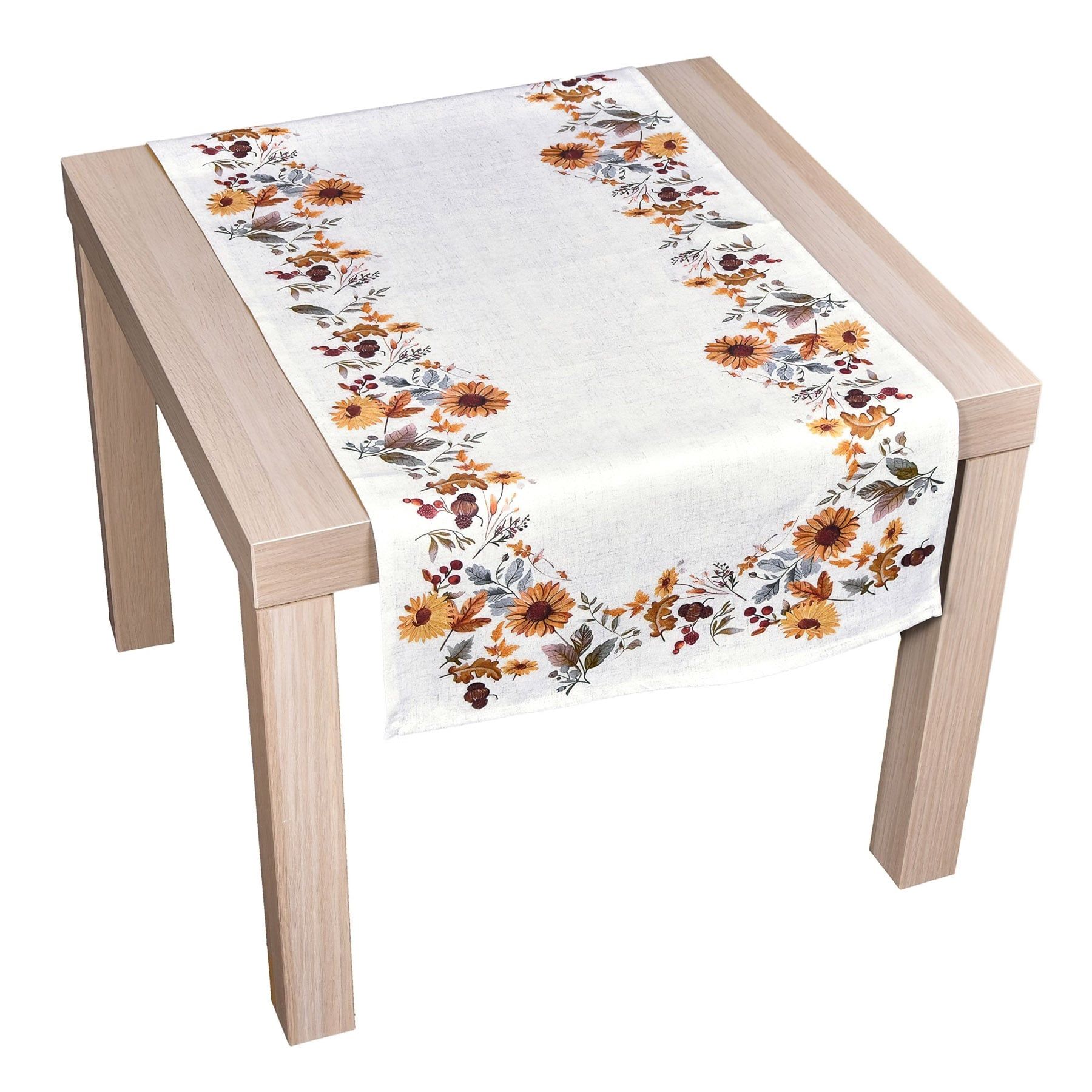 Kuchyňský ubrus s podzimním vzorem listů a květin v oranžových barvách na bílém podkladu je vyrobena ze 100 % polyesteru ve čtvercovém rozměru 40x90cm.