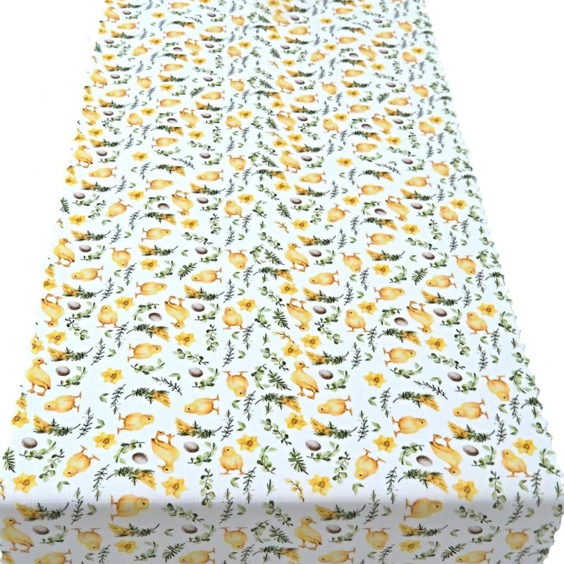 Látková ubrusovina / štola s vodoodpudivou teflonovou vrstvou se vzorem kuřátek, kachniček, vajíček a květin na bílém podkladu s vlnkovanými okraji. Díky teflonové vrstvě se rozlité tekutiny do ubrusu nevsáknou a dají se snadno setřít ubrouskem (neplatí však pro mastnotu). Ubrusovina je vyrobena ze 100% polyesteru a je dostupná v metráži o šířce 38cm, takto široká ubrusovina má využití jako středový pás na stůl nebo také prostírání.