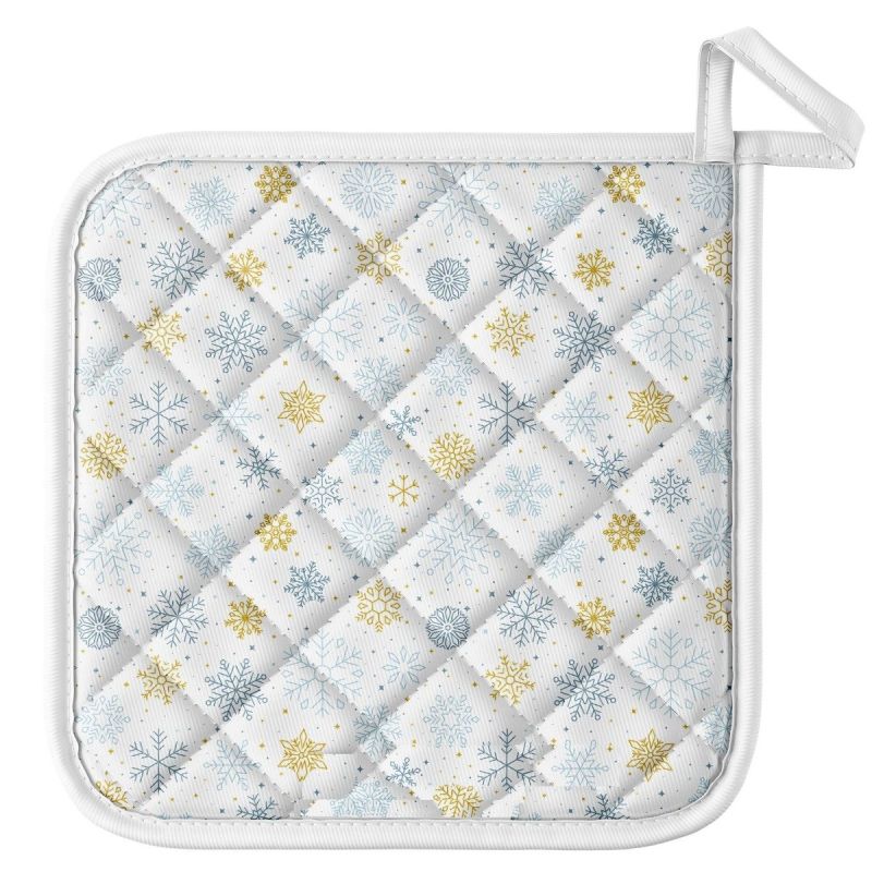 Kuchyňská podložka pod horké hrnce je vyrobena ze 100% bavlny s výplní ze 100% polyesteru (rouno z dutého vlákna) ve čtvercovém rozměru 20x20 cm s motivem modrých a béžových vloček na bílém podkladu.