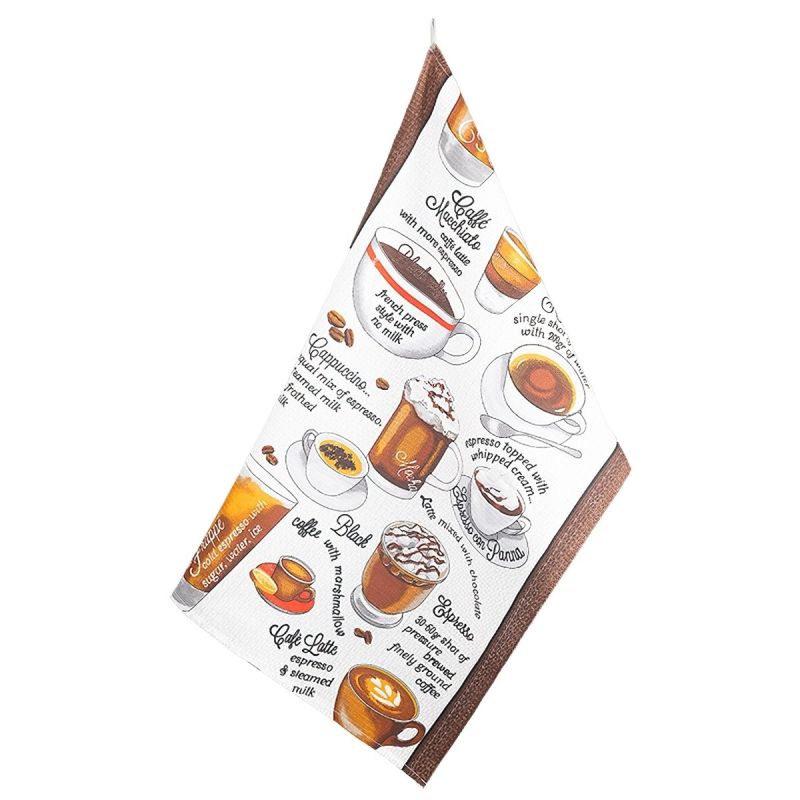 Vaflová kuchyňská utěrka ze 100% bavlny (gramáž 175g/m2) v rozměru 50x70cm se vzorem kávy v hnědých barvách na bílém podkladu. Utěrka má vaflovou vazbu. Utěrky dobře absorbují vodu, dokonale s nimi utřete jakýkoliv mokrý povrch.