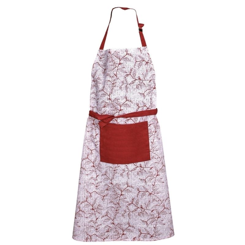 Kuchyňská zástěra je vyrobena ze 100% bavlny v rozměru 70x90 cm se vzorem lístků v červeno-bílých barvách.