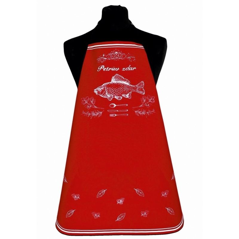 Kuchyňská zástěra je vyrobena ze 100% bavlny v rozměru 63x80 cm se vzorem ryby a nápisem Petrův zdar v červeném provedení.