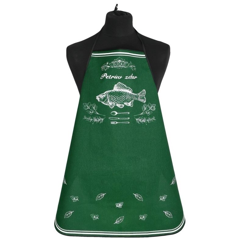 Kuchyňská zástěra je vyrobena ze 100% bavlny v rozměru 63x80 cm se vzorem ryby a nápisem Petrův zdar v tmavě zeleném provedení.