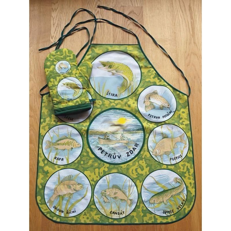 Kuchyňská zástěra s rybářským vzorem sladkovodních ryb (štika, kapr, pstruh, sumec, candát, okoun, plotice) v zelené barvě. Zástěra je vyrobena ze 100% bavlny v rozměru 63x73 cm. Opatřeny je poutkem pro snadné uložení a manipulaci.