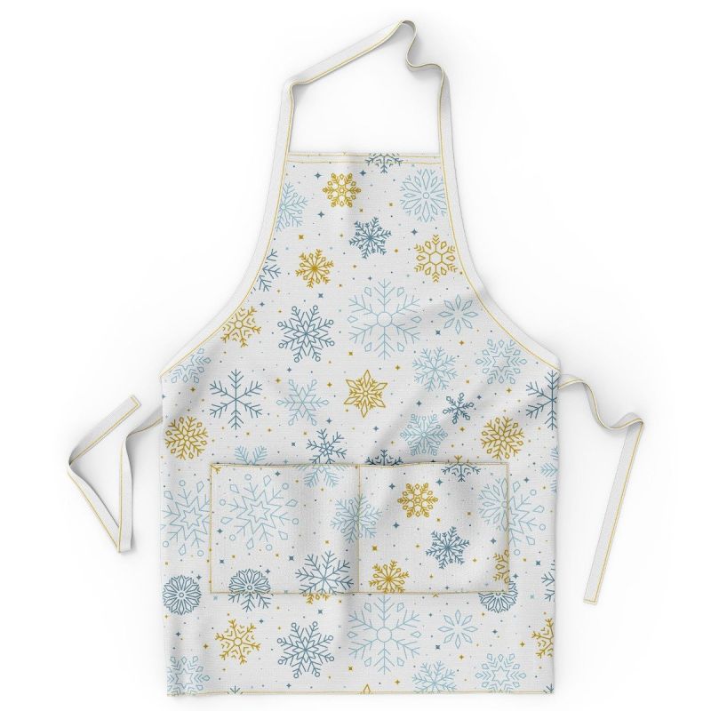 Kuchyňská zástěra je vyrobena ze 100% bavlny v rozměru 60x75 cm se vzorem modrých a béžových vloček na bílém podkladu.