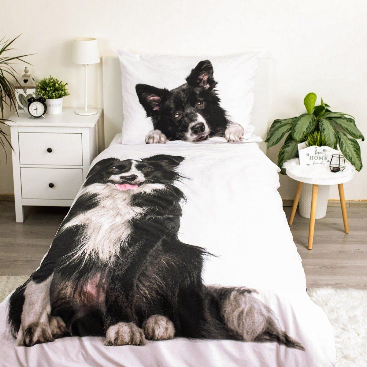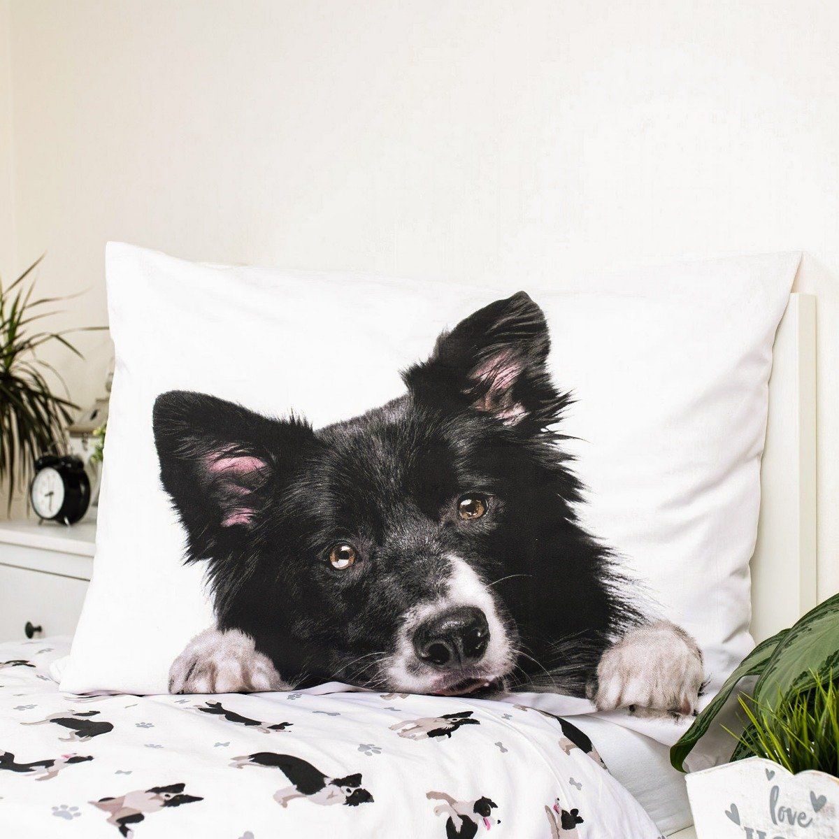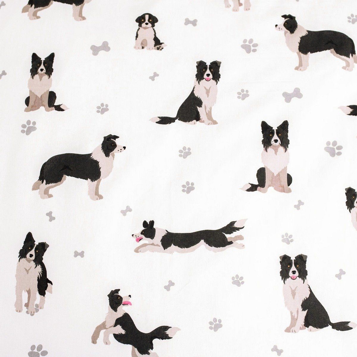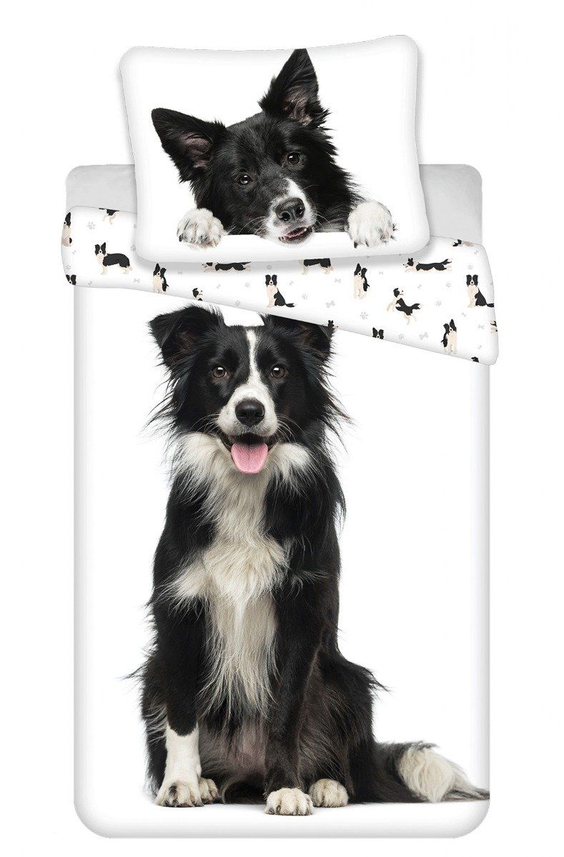 Dětské bavlněné povlečení s motivem psa Border kolie na bílém podkladu. Povlečení je oboustranné, z jedné strany je velký vzor pejska, z druhé strany je vzor malých pejsků. Souprava je vyrobena ze 100% bavlny a obsahuje jeden povlak na přikrývku 140 x 200 cm a jeden povlak na polštář 70 x 90 cm. Zapínání na zip.Dětské povlečení rozveselí každý dětský pokojíček a dětem se v něm bude krásně usínat. Maminky zase ocení vysoce kvalitní materiál, díky kterému si povlečení zachová své vlastnosti i po mnoha vypráních. Díky speciální technice tisku je také zaručena barevná stálost. Povlečení doporučujeme prát na 60°C tiskem dovnitř, při nastavení nižších otáček ždímání si také usnadníte žehlení. Vyberte si to pravé pro Vaše dítě.