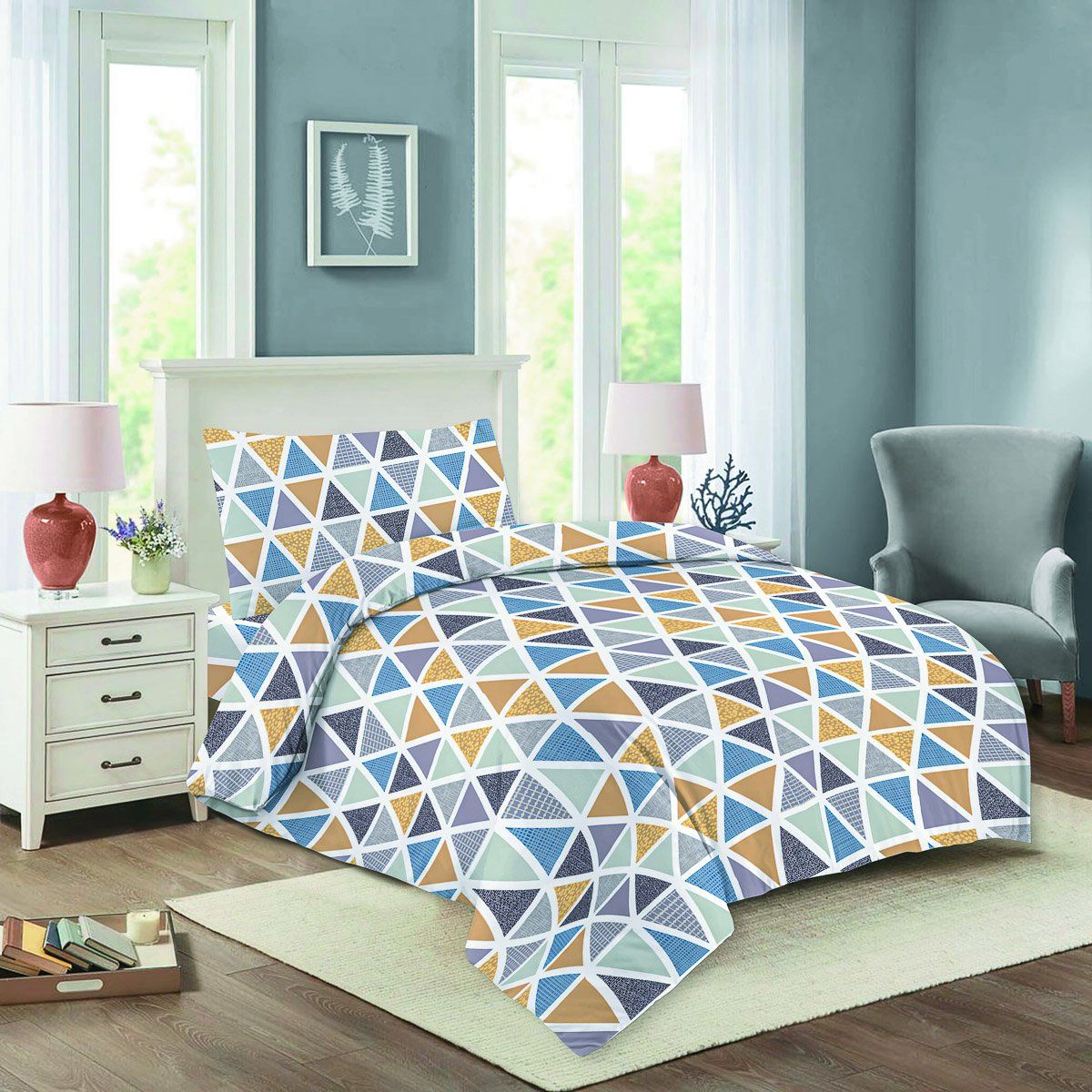 Bavlněné povlečení za dostupnou cenu se vzorem trojúhelníků v modré, okrové a mentolové barvě. Povlak na přikrývku i pov...