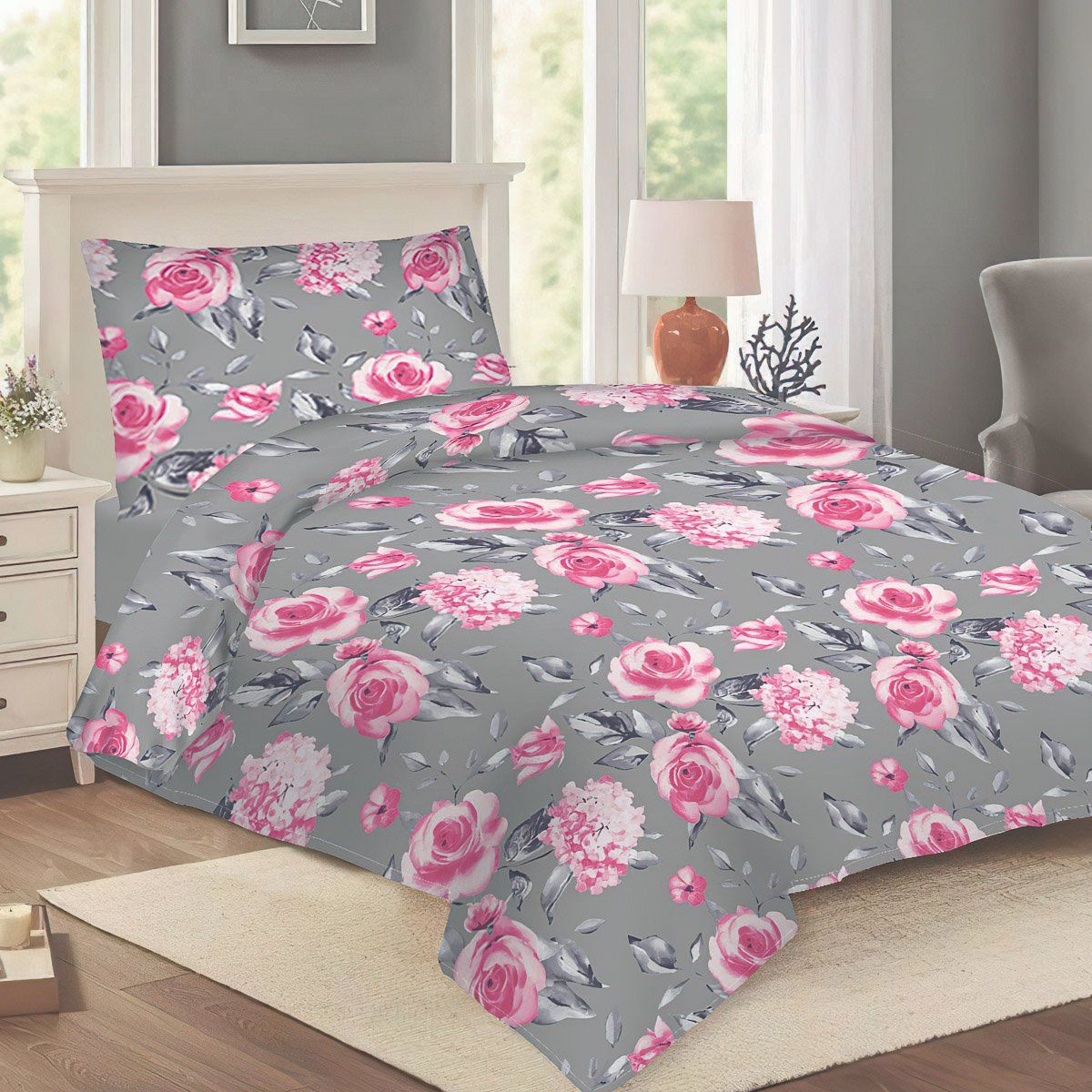 Bavlněné povlečení za dostupnou cenu se vzorem růžových růží na šedém podkladu. Povlak na přikrývku i povlak na polštář mají vzor z obou stran stejný. Souprava je vyrobena ze 100% bavlny (gramáž 120g/m2) a obsahuje jeden povlak na přikrývku 140 x 200 cm a jeden povlak na polštář 70 x 90 cm. Zapínání na zip.Ložní povlečení ze 100% bavlny bude skvělým doplňkem Vaší ložnice. Povlečení doporučujeme prát v pračce na 60°C tiskem dovnitř, při nastavení nižších otáček ždímání si také usnadníte žehlení s vyjímkou krepového povlečení, které se nežehlí. Vyberte si to pravé pro Vás!
