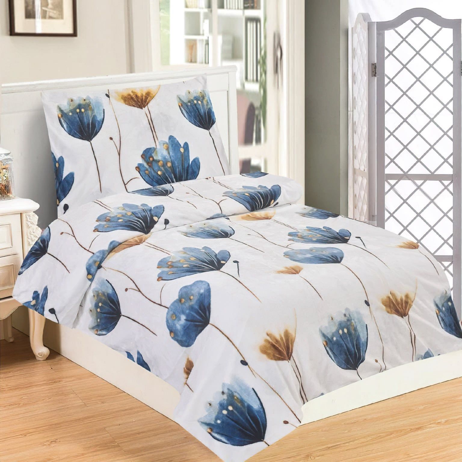 Mikroflanelové povlečení z kolekce MyHouse se vzorem modrého (islandského) vlčího máku na bílém pozadí. Povlečení je z obou stran stejné. Mikroflanel se vyznačuje svou velkou hebkostí a hřejivostí v zimě, v létě naopak příjemně chladí. Souprava je vyrobena ze 100% polyesteru a obsahuje jeden povlak na přikrývku 140 x 200 cm a jeden povlak na polštář 70 x 90 cm. Zapínání na zip.Kvalitní ložní povlečení z mikroflanelu bude skvělým doplňkem Vaší ložnice. Materiál je tvořen hustými krátkými chloupky, které zajistí vysokou hřejivost, hebkost a měkkost. Díky svým termoregulačním vlastnostem Vás velmi rychle zahřeje, a je tak doporučováno zejména do chladného období (v létě je naopak možné jej používat jen tak bez přikrývky). Vyberte si to pravé pro Vás!