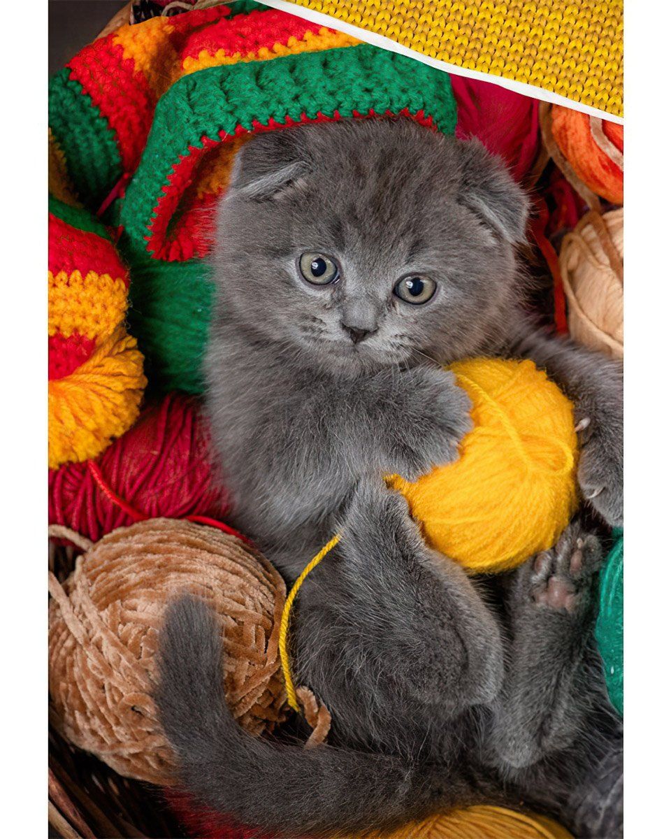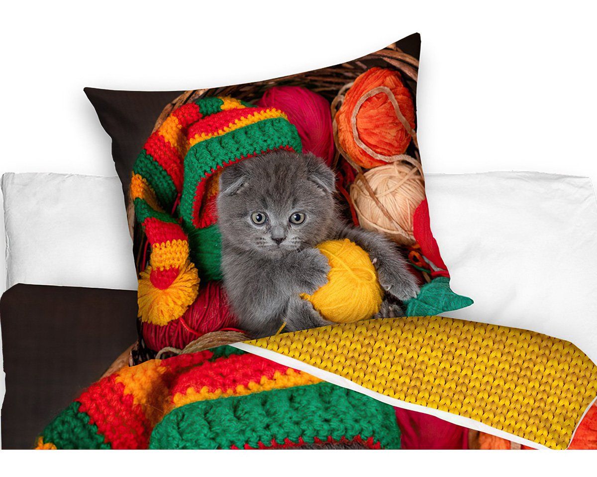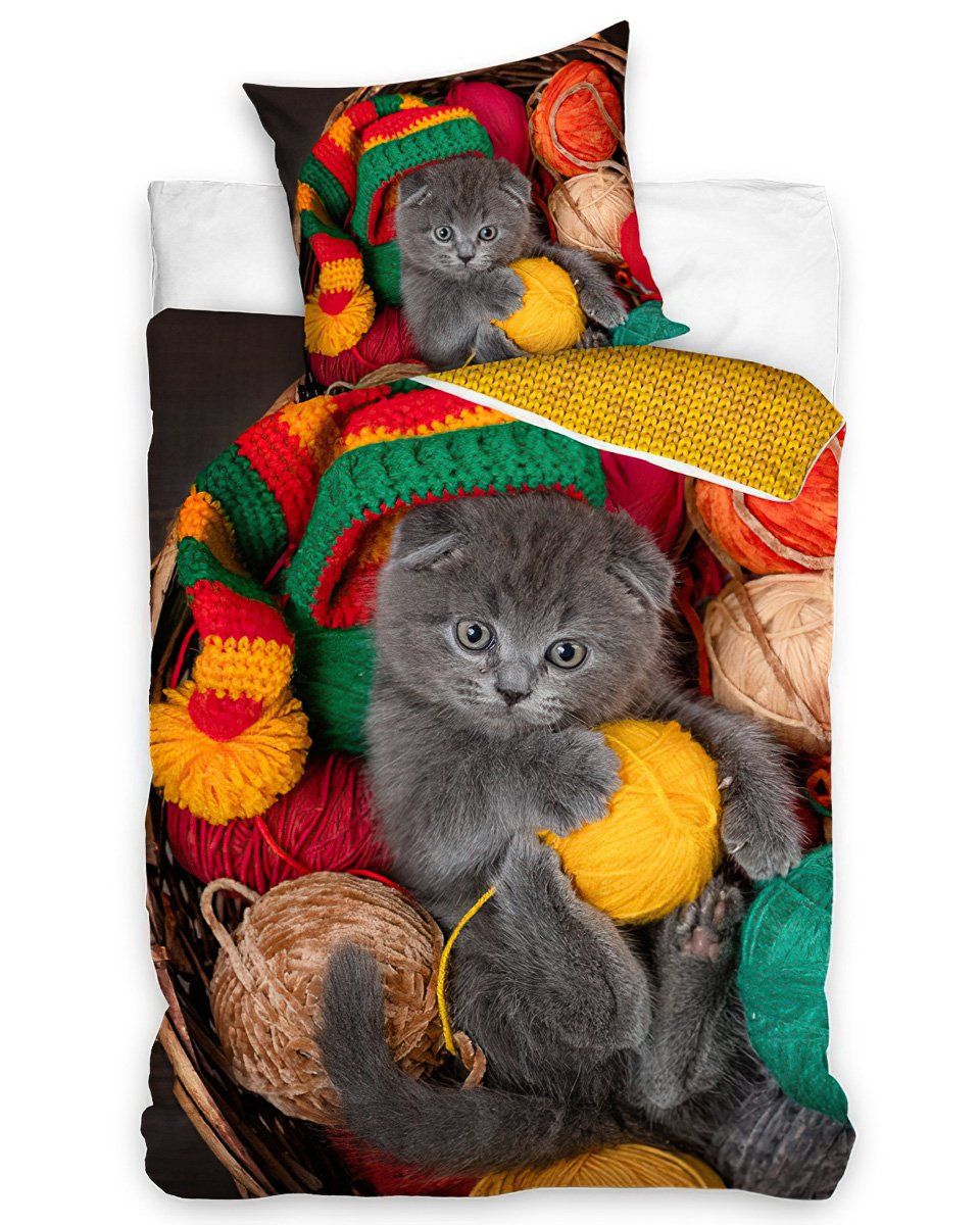 Bavlněné povlečení s motivem malého koťátka v košíku s barevnými klubíčky. Povlečení je oboustranné, z druhé strany má p...