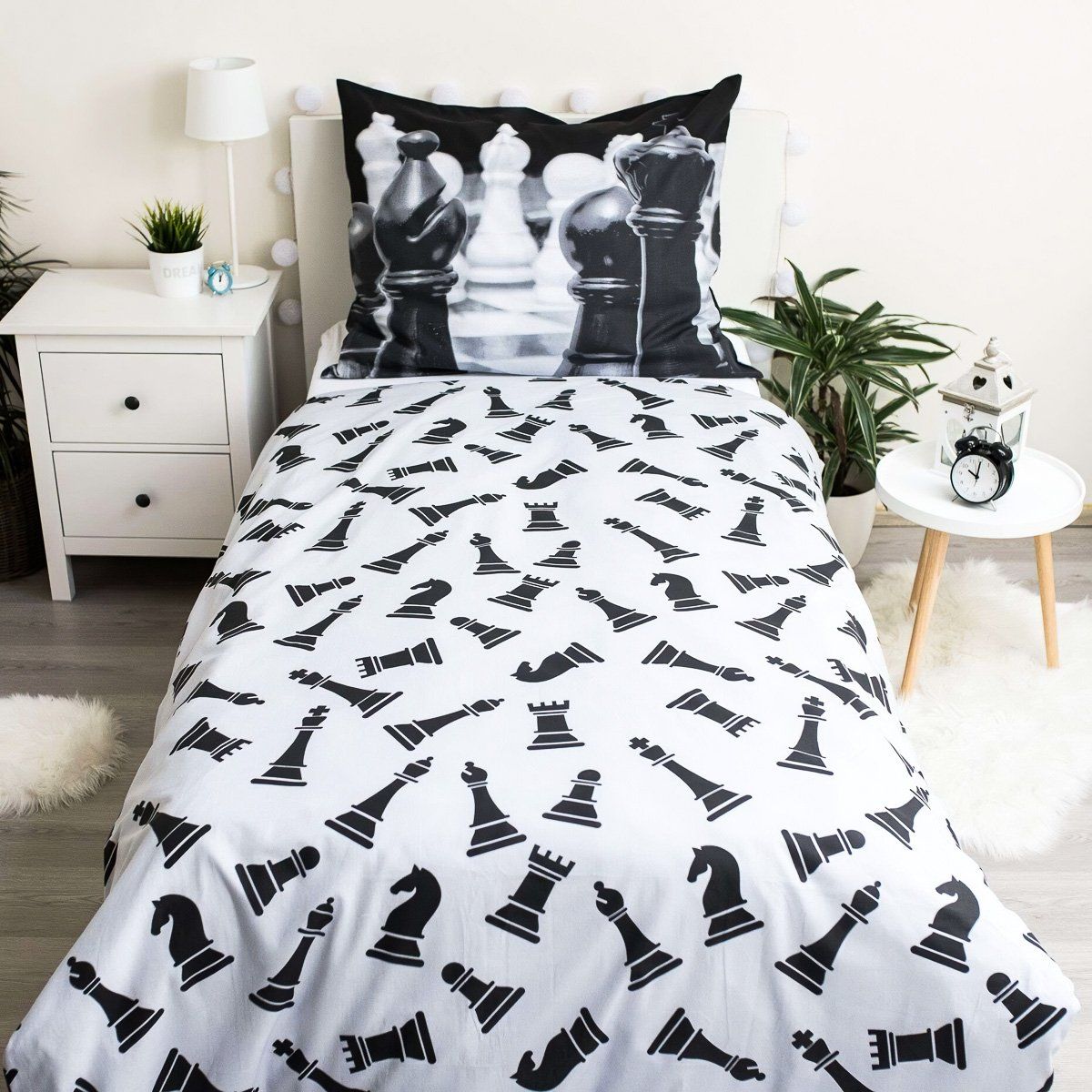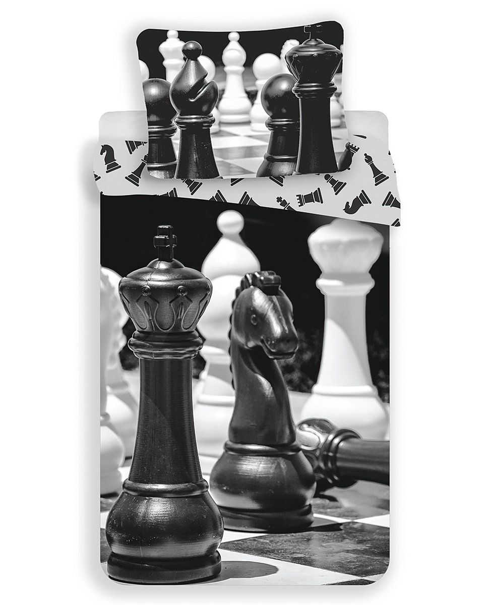 Bavlněné povlečení s motivem šachových figurek v černo-bílé barvě. Na lícní straně jsou velké figurky. Druhá strana má figurky malé na bílém pozadí. Souprava je vyrobena ze 100% bavlny a obsahuje jeden povlak na přikrývku 140 x 200 cm a jeden povlak na polštář 70 x 90 cm. Zapínání na zip.Bavlněné hudební povlečení s motivem šachů v černo-bílé barvě. Ověřená kvalita materiálu povlečení je zárukou dlouhé životnosti. Díky speciální technice tisku je také zaručena barevná stálost. Povlečení doporučujeme prát na 60°C tiskem dovnitř, při nastavení nižších otáček ždímání si také usnadníte žehlení.