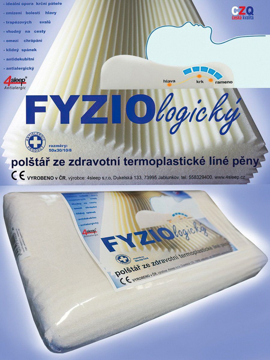 Anatomický fyziologický polštář vyrobený ze zdravotní termoplastické líné pěny, která zajistí ideální oporu krční páteře. Díky tomu zmizí bolesti hlavy, ztuhlý krk nebo bolesti trapézových svalů způsobené nesprávnou polohou při spánku. Zároveň je tento polštář antidekubitní - proti proleženinám a antialergický.