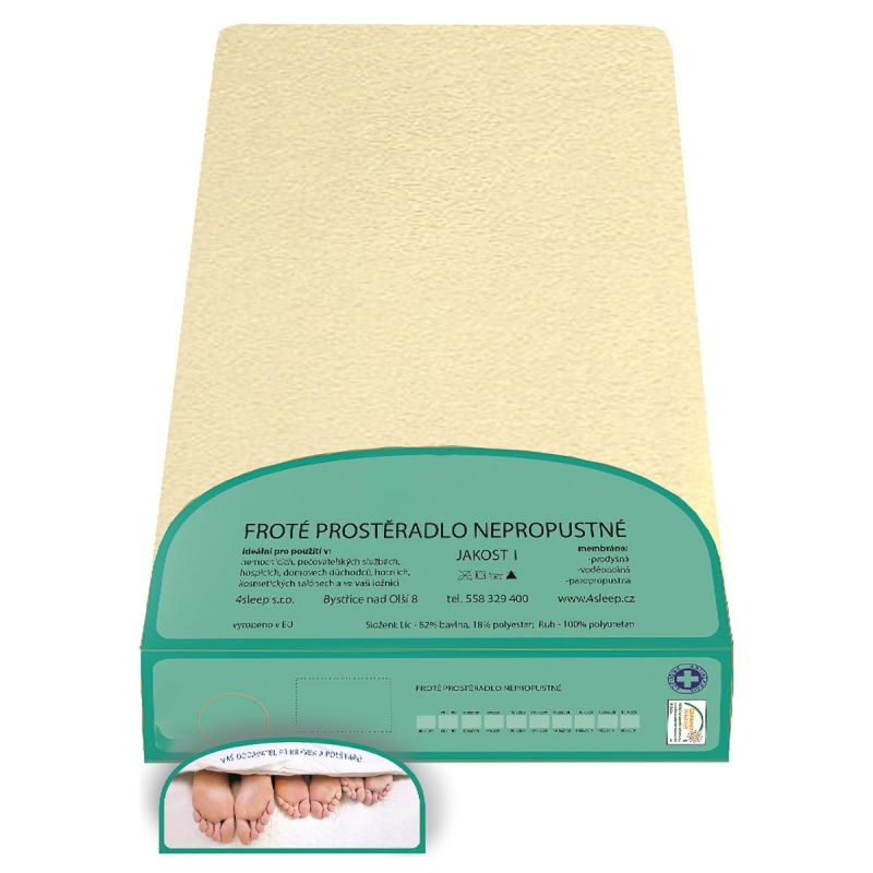 Nepropustné froté napínací prostěradlo, nepromokavé, ale přesto prodyšné, se sací schopností (Líc: 82% bavlna, 18% polyester, Rub: 100% polyuretan). Prostěradlo zlepšuje osobní hygienu a udržuje matraci vždy suchou a čistou díky dokonalé přilnavosti k matraci s výškou až 22 cm. Prostěradlo je účinnou ochrannou bariérou proti vlhku, prachovým roztočům, bakteriím, choroboplodným zárodkům a mikroorganismům. Je vhodné jako prevence před látkami vyvolávajícími alergii a při inkontinenci a podobných obtížích. Využití má zejména při péči o děti a seniory. Nepropustné froté prostěradlo lze snadno udržovat, lze jej prát v pračce a vyvářet i na 90°C. POZOR: nepropustné prostěradlo perte v pračce vždy samostatně a svázané! V opačném případě hrozí poškození nepromokavé vrstvy.