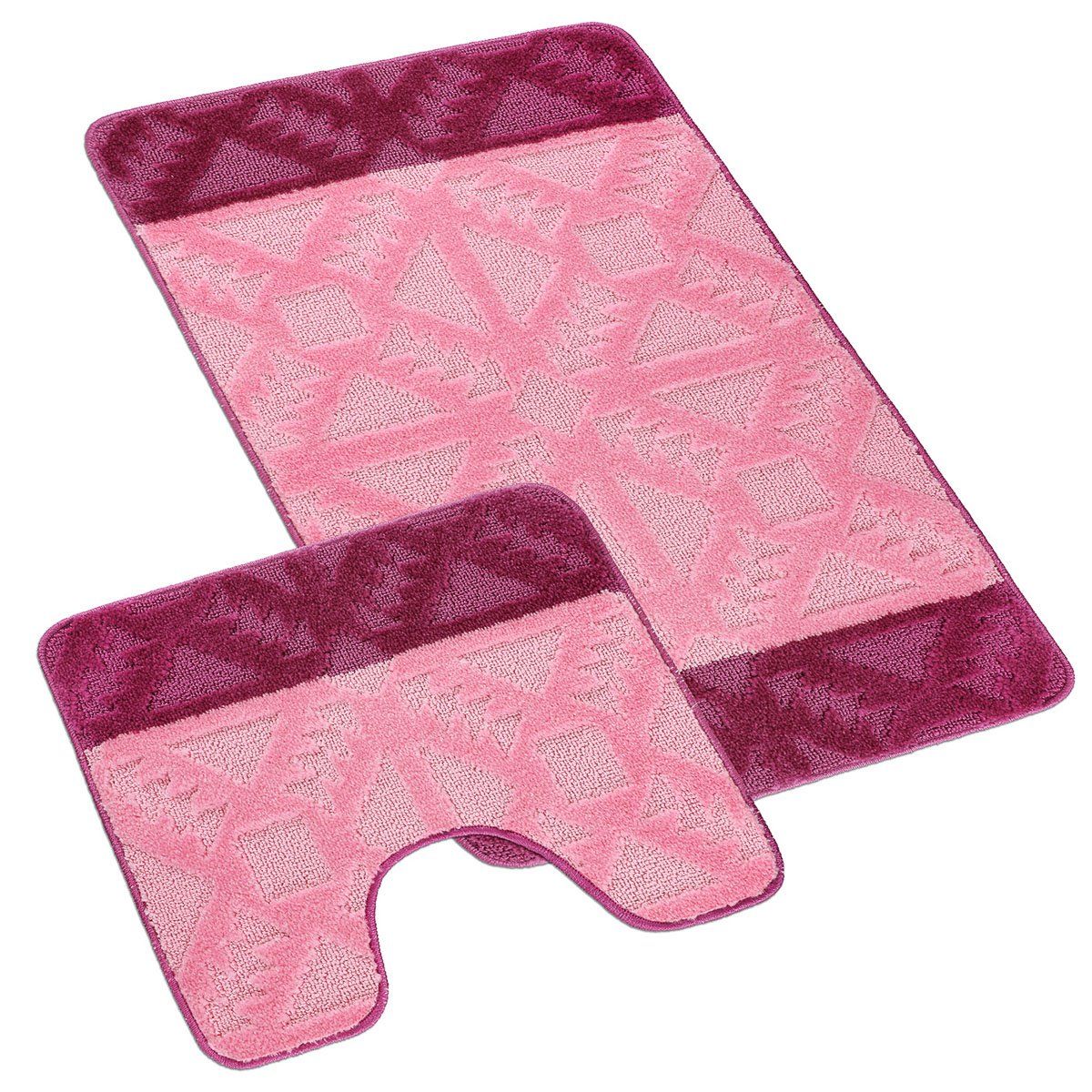 Koupelnové předložky s geometrickým vzorem v růžových odstínech z kolekce Bany jsou vyrobeny ze 100% polypropylenu. Latexový nátěr na rubu předložky vytváří protiskluzový povrch. Velká souprava se skládá z předložky do koupelny 60 x 100 cm a předložky před WC 60 x 50 cm (lze objednat samostatně).